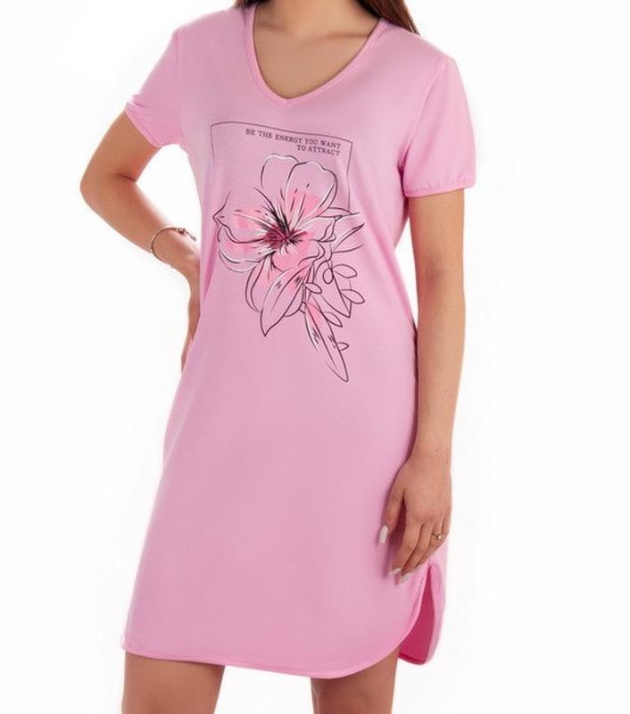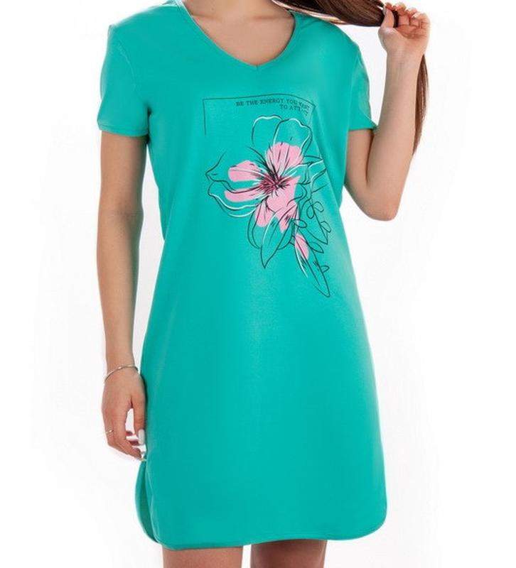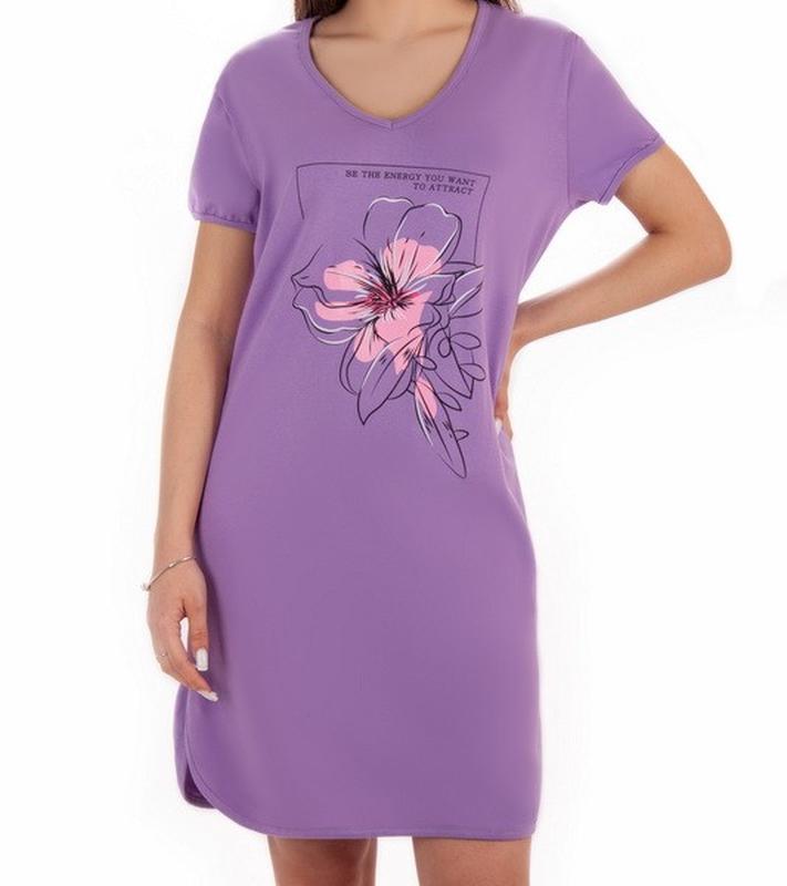 Новинка сезону - жіноча домашня сукня. Зручна та комфортна модель з коротким рукавом, з овальним вирізом горловини, по переду нанесений стильний накат, який виконаний методом шовкотрафаретного друку. Сукня виконана з дуже м'якого, тонкого, приємного на дотик бавовняного трикотажного полотна. Розміри: 42-48