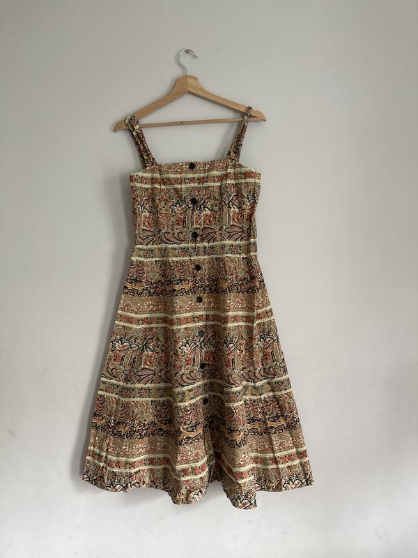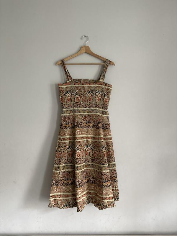 Коттоновое платье с принцем в стиле этно.Качество в соответствии с английского производителя. На бирже указан размер 14, и маломерит, скорее пойдет на 10 и частично 12.Длина 108.ПОГ 38.ПОТ 33 (не тянется)