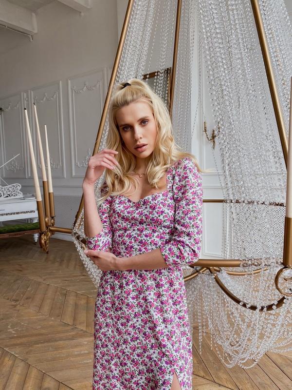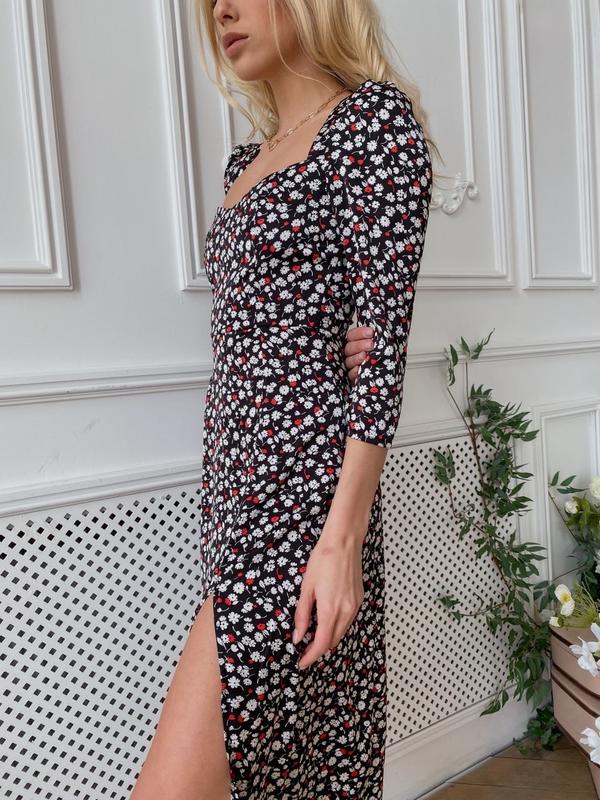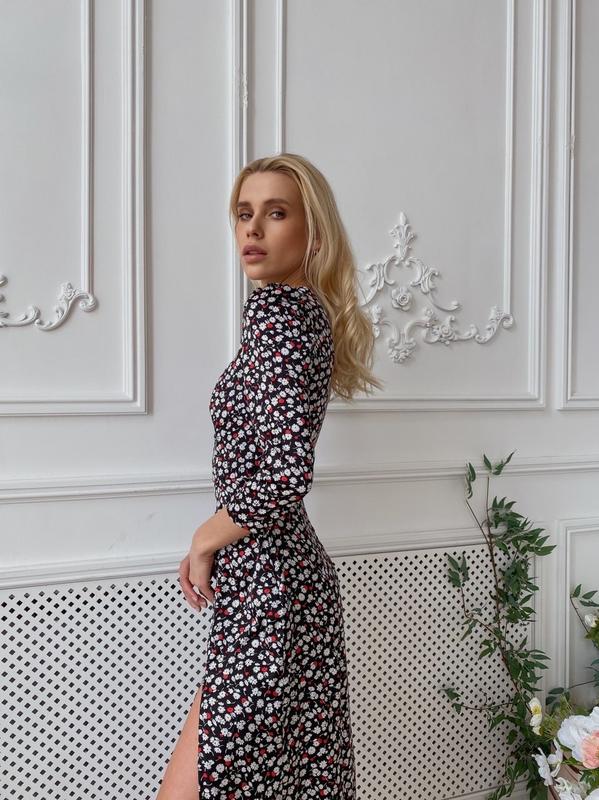 Элегантное платье из декольтеДлина миди, разрез на одной сторонеРукав 3/4Застегивается по спинке
