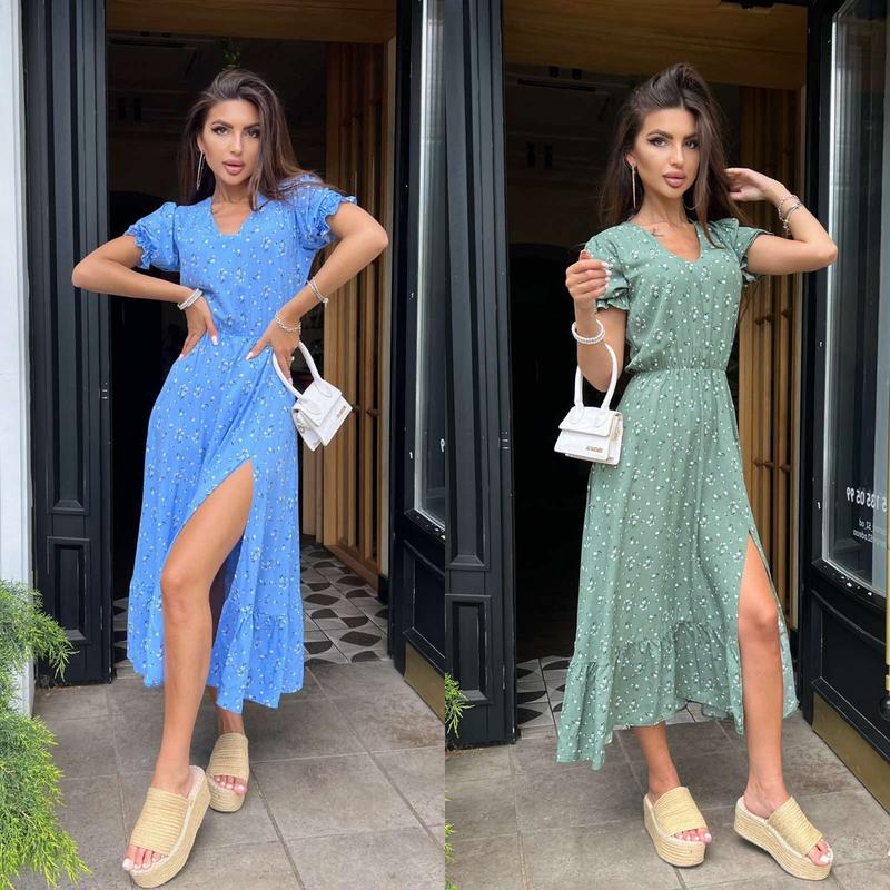 Талия и рукава платья на резиночке, по низу волан, сбоку разрез