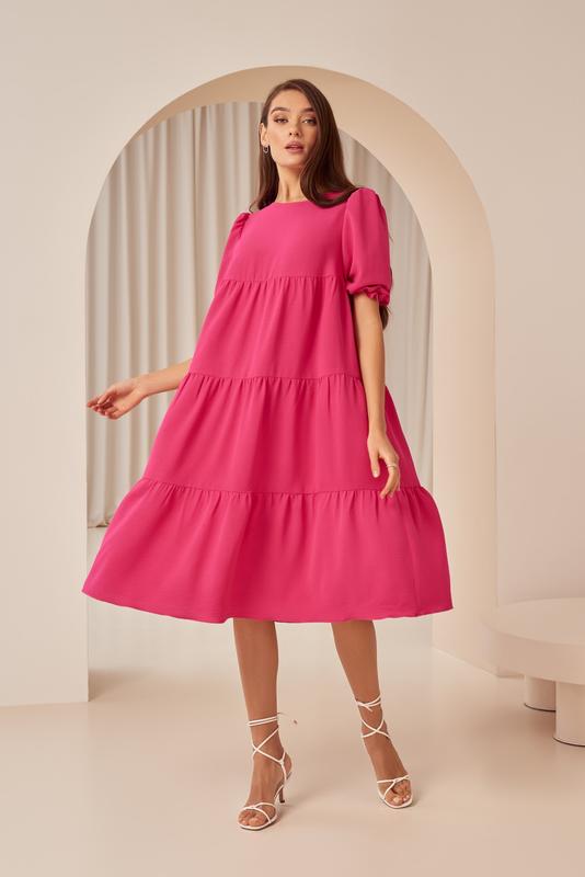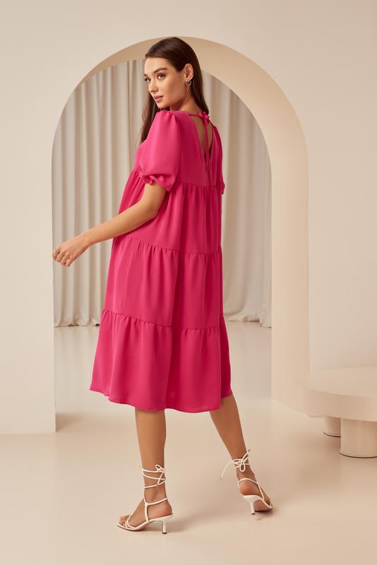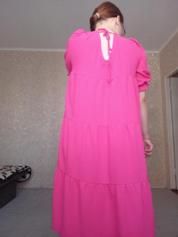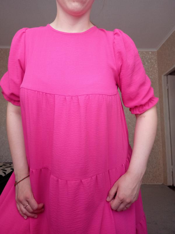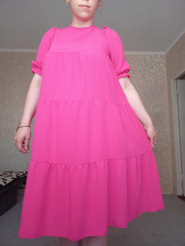Фасон: миди; цвет: розовый/фуксия ; материал: вискоза. Обхват груди: 88-94, талии 70-76, бедер 96-102. Состав : 65% вискоза, 30% полиэстер, 5% эластан размер S-M, просторная. Совершенно новая с биркой и штрихкодом