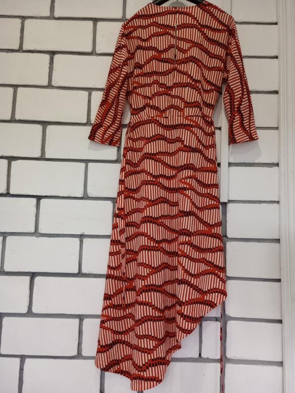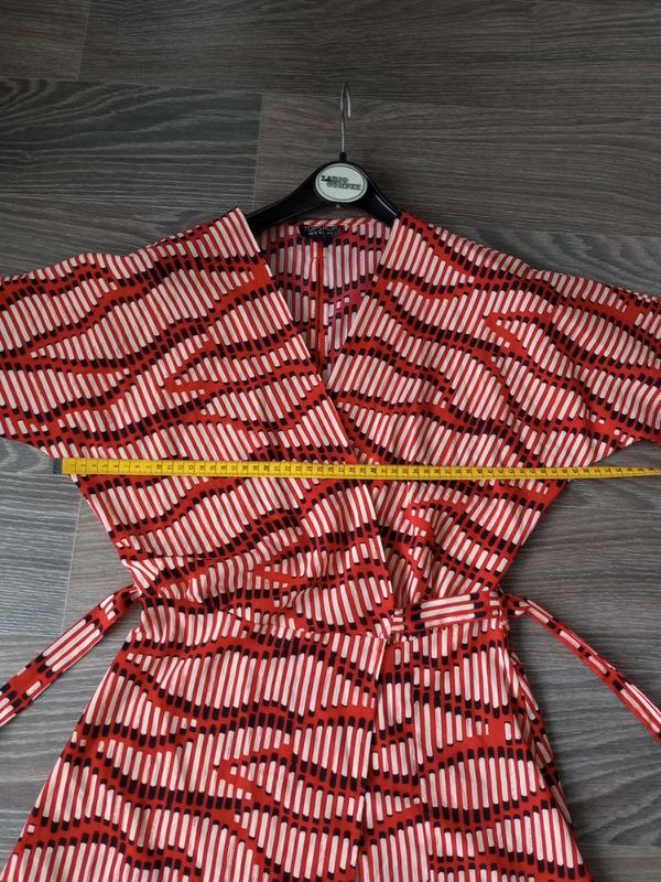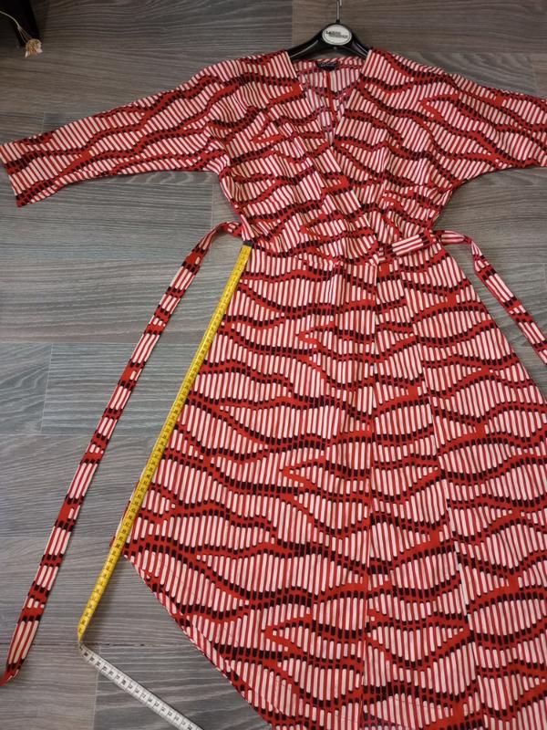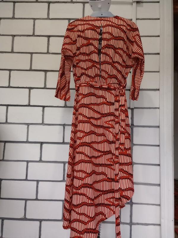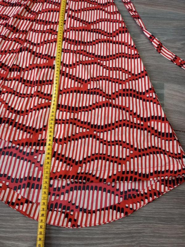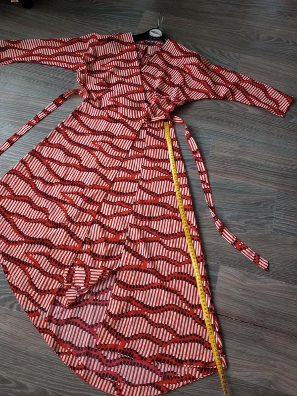 Очень орригинальное платье на запах ПО ( фото 3) 50 смПОТ 33, 5 см, и регулируетсяПО 52 смна плечах разрез до талиидлина от талии до низа ( 3 кромки фото):левая сторона 78 см, правая 50 см состояние новой
