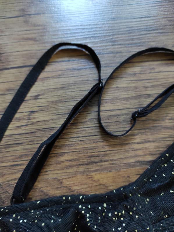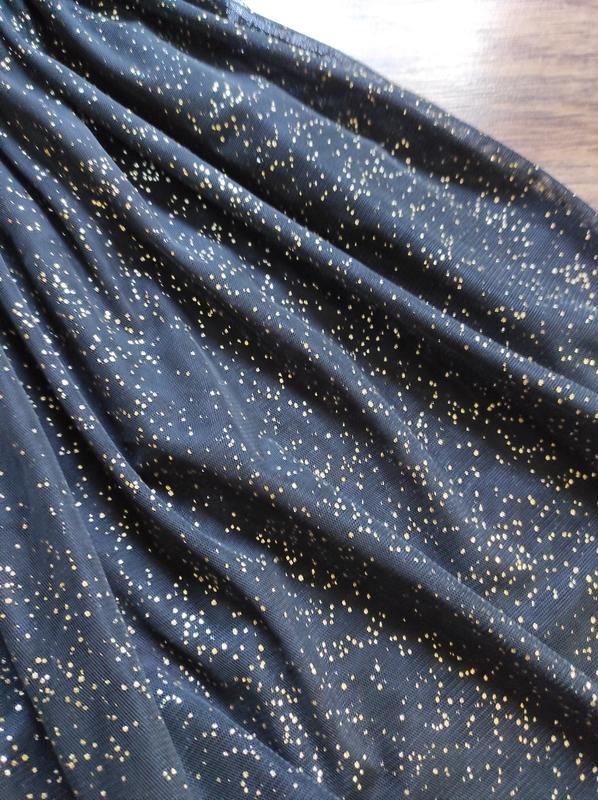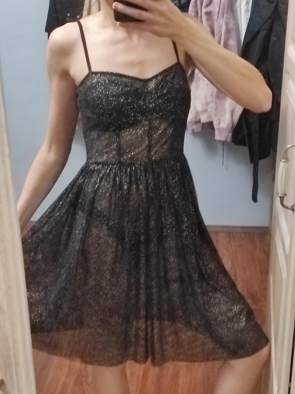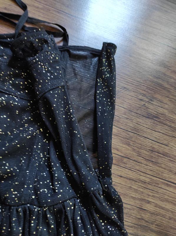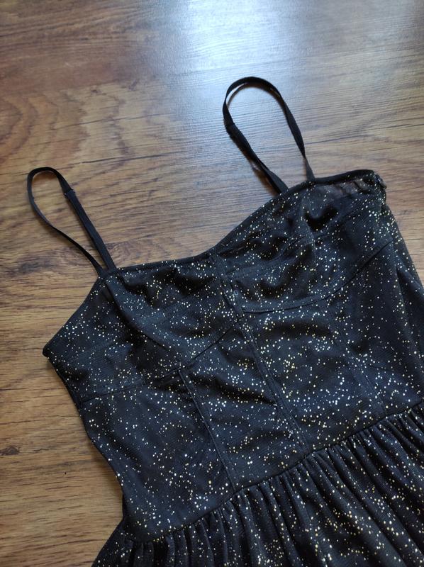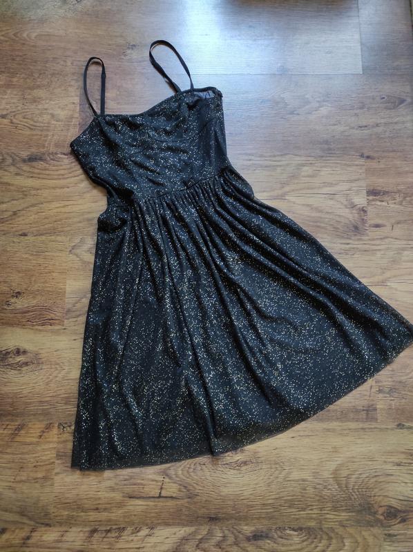 Платье H&M, размер М.Длина 94см. (регулируется)Полуобхват подмышками 38/45см.Полуобхват по поясу 34см.Одетая на размер S/166см.Насыщенный черный цвет + золотые блестки.Сбоку молния, шлейки регулируются.Отличное состояние.