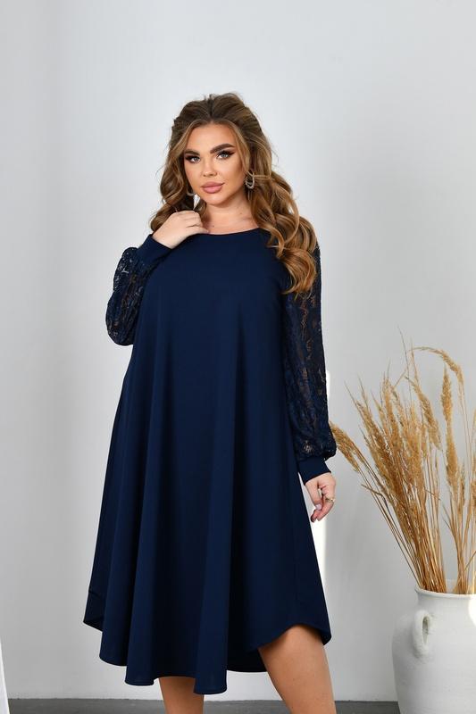 Ткань: гипюр, креп-стрейч, Длина: 116-122 см Длина рукава: 63 см Рост модели: 168 см Дополнительная информация: вырез горловины круглый, низ платья асимметричный, рукав на манжетах,