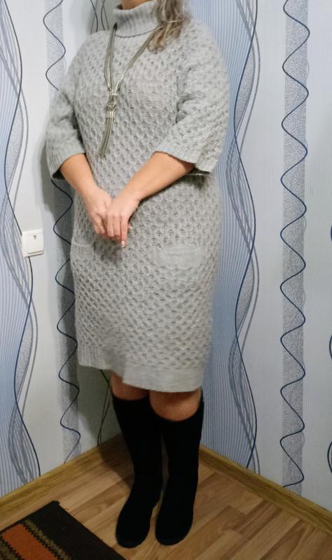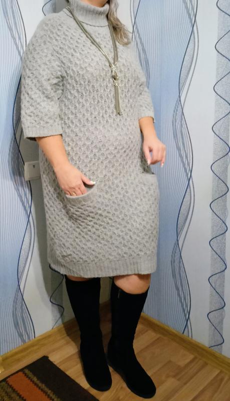 Очень классное, стильное, качественное платье, крой прямой свободный,рукав три четверти,ворот двойной стойки, спереди глубокие карманы, цвет серый,узор косы, состав шерсть и акрил, платье новое,пог-55,пот-55, поб-57, длина -98, длина рукава -38,все замеры выполнены в спокойном состоянии хорошо тянется.