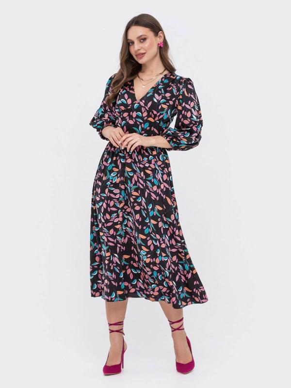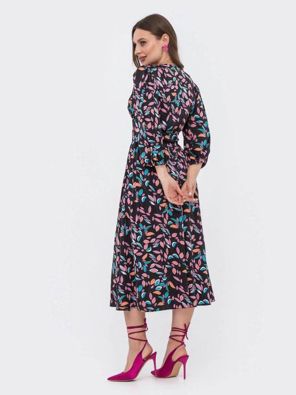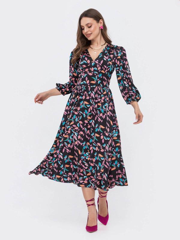Шелковое платье черное в принт с расклешенной юбкой. Изделие с V-образным вырезом. Отрезанное по талии. Объемный рукав 3⁄4 на резинке. Застегивается на молнию.