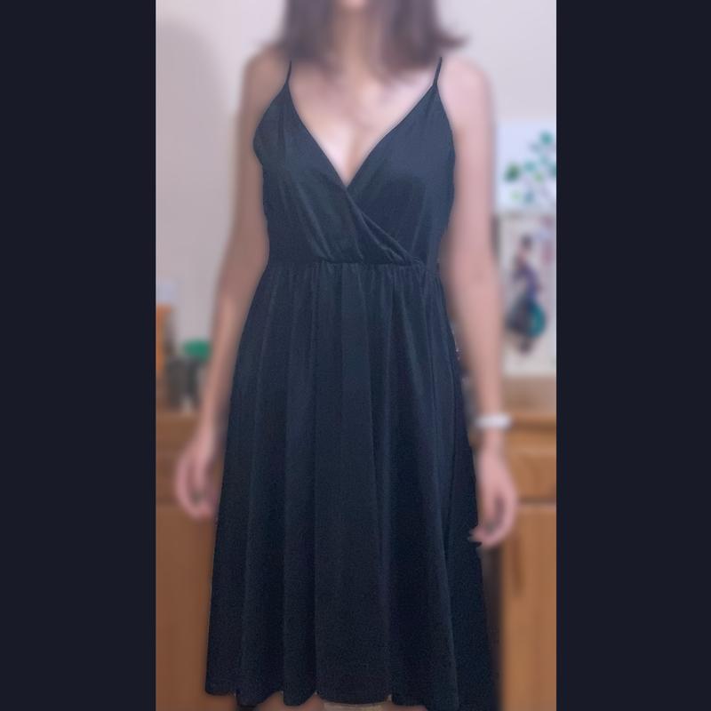 Черное блестящее вечернее платье с большим вырезом, на рост 175 - по колено. Бирка пишет С, с Мой размером ХС-С было слишком большое, лучше подойдет на С-М. Материал полиэстер, дефектов отсутствуют, лямки регулируются, спина закрыта, с молнией