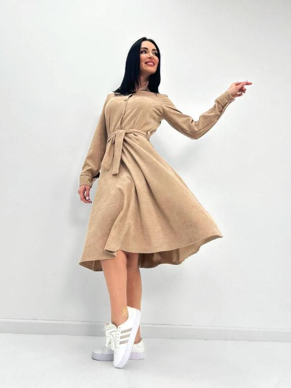 Вельветовое платье имеет длину миди, подчеркнет талию и скроет недостатки в области бедер. Платье прекрасно сочетается как со спортивной обувью так и с каблуком - Длина по спинке: 109-113 см - Длина рукава: 61-64 см - Материал: Микровельвет