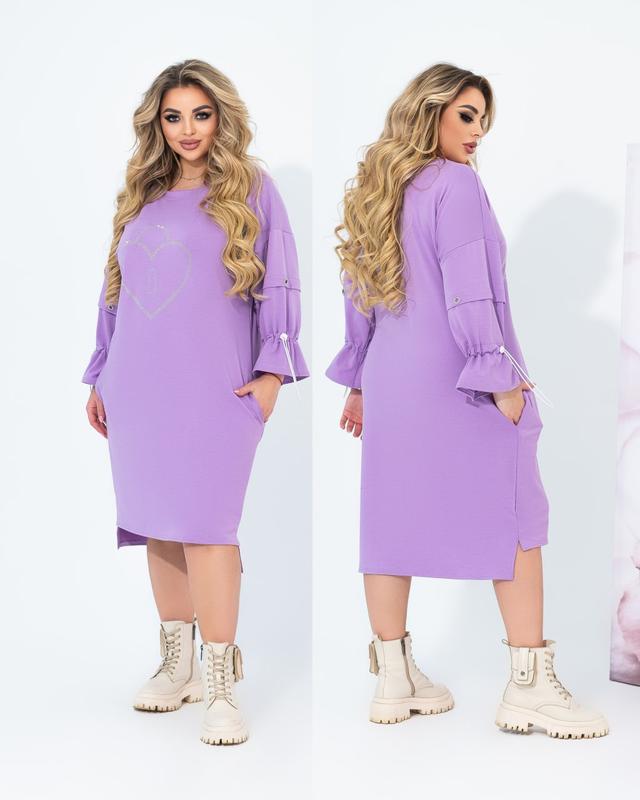 Стильное и комфортное платье в стиле спортшик из трикотажа двухнитки (растяжимость средняя). Силуэт прямой, свободный. Вырез горловины круглый. Линия плеча спущена, рукав 3/4 прямой, широк, декорирован люверсами и затяжкой на резинку. На передней полочке – аппликация из страз. Низ платья асимметричен, спереди короче, сзади чуть длиннее, по бокам небольшие разрезы. В боковых швах обработаны карманы.