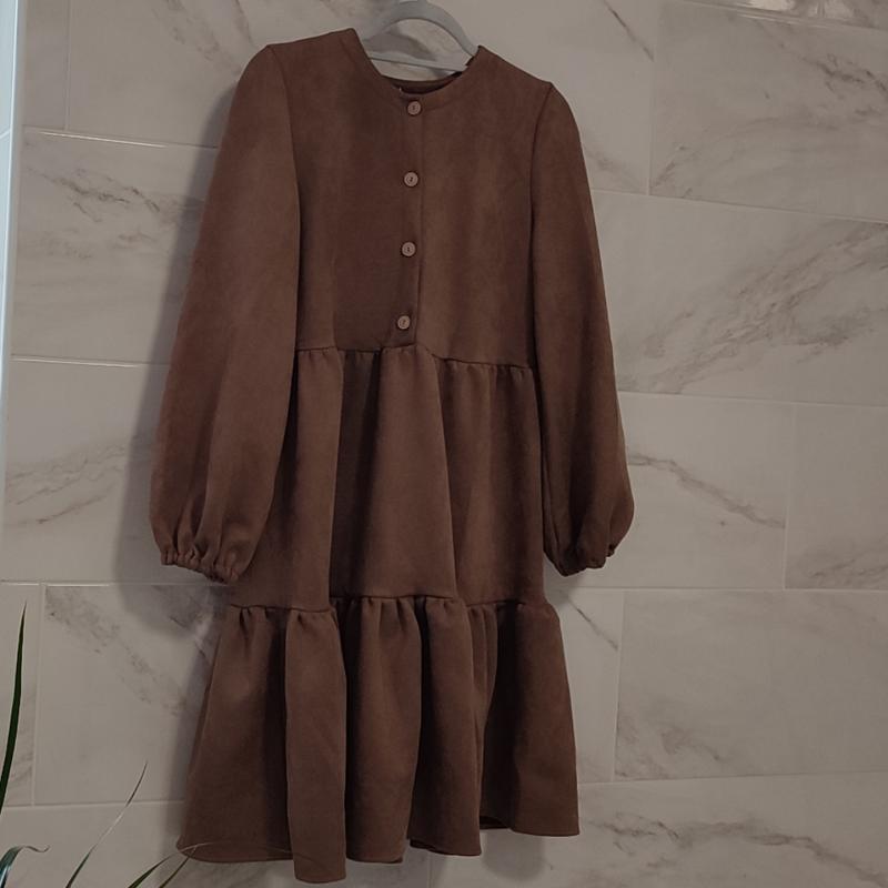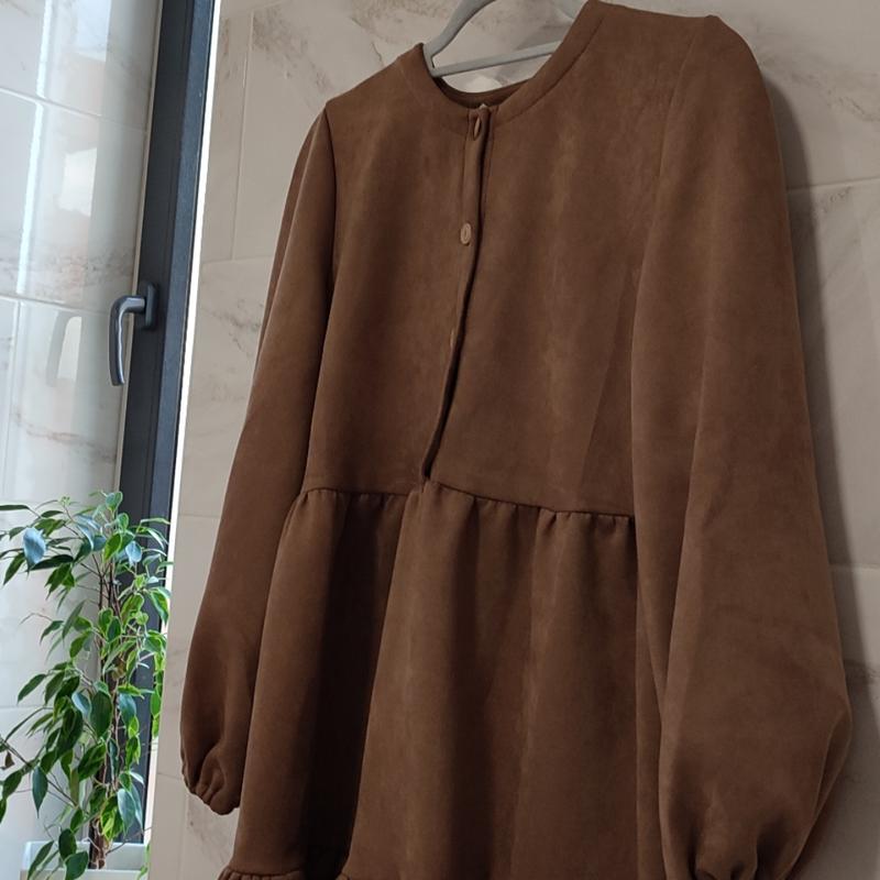 платье свободного фасона размера s ткань плотная под замш на резиночках в плечах 35 см рукавчик 56 см длина платья 90 см в груди 43 см идеальное состояние