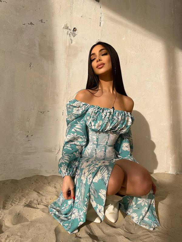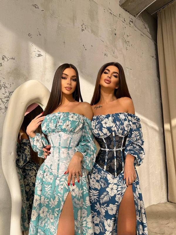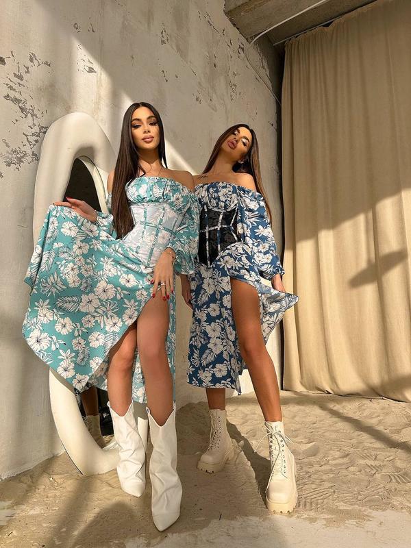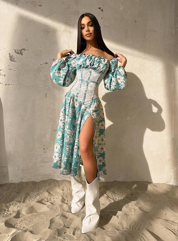 Платье миди с разрезом в цветочный принт + прозрачный корсет