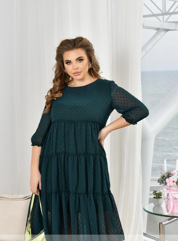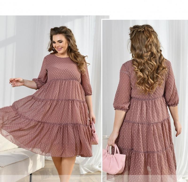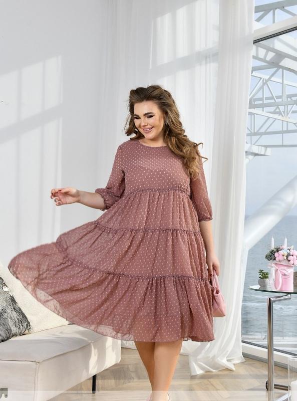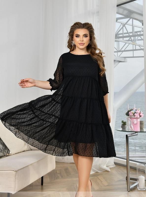 Легка, зручна та приваблива сукня батал з підкладкою та сіточкою. Сіточка призібрана складками в декілька рядів. Рукава - з сіточки без підкладки, мають вшиті резинки. Кишень і застібок немає, виріз горловини "човник".
