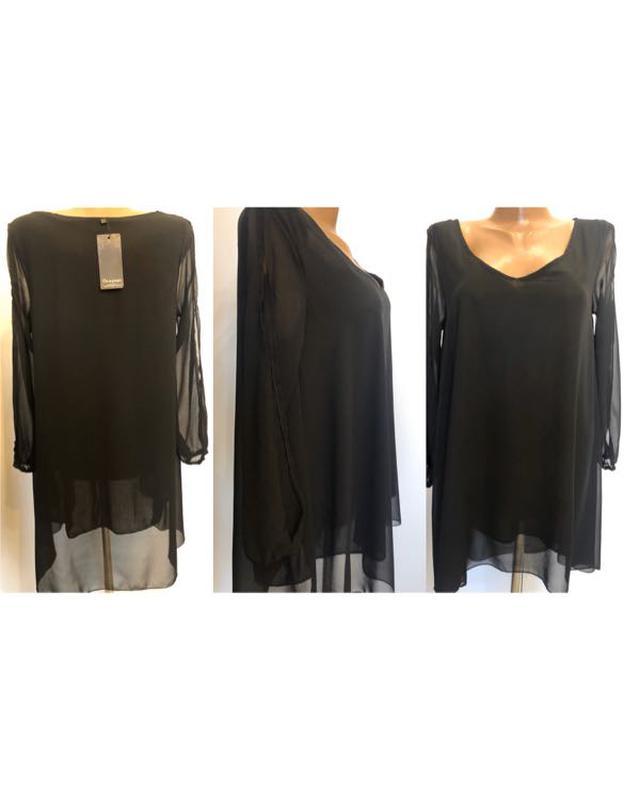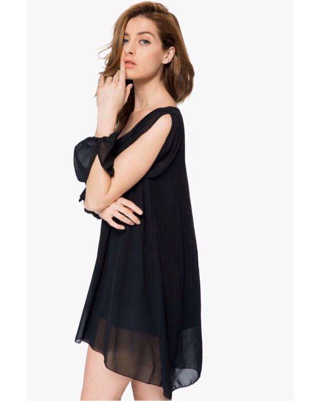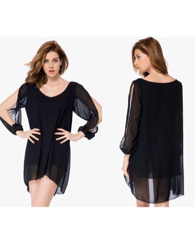 Чорне плаття розлітайка з вирізами на рукавах. Плаття нове з біркою, тканина шифон. Розмір пише М, але насправді я би сказала навіть L.