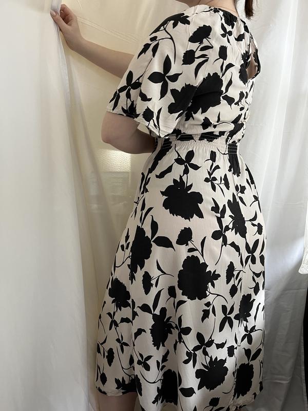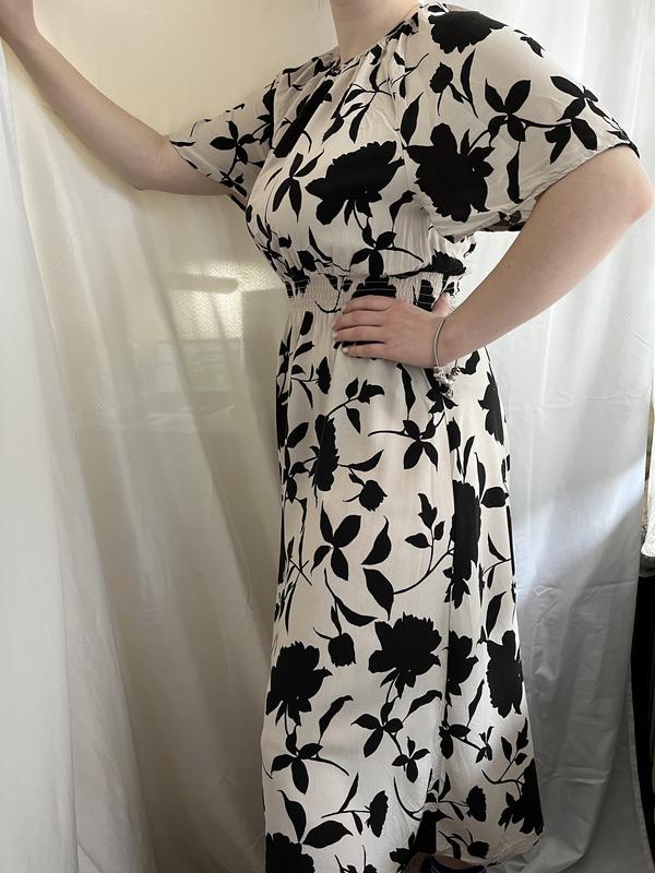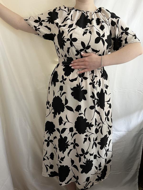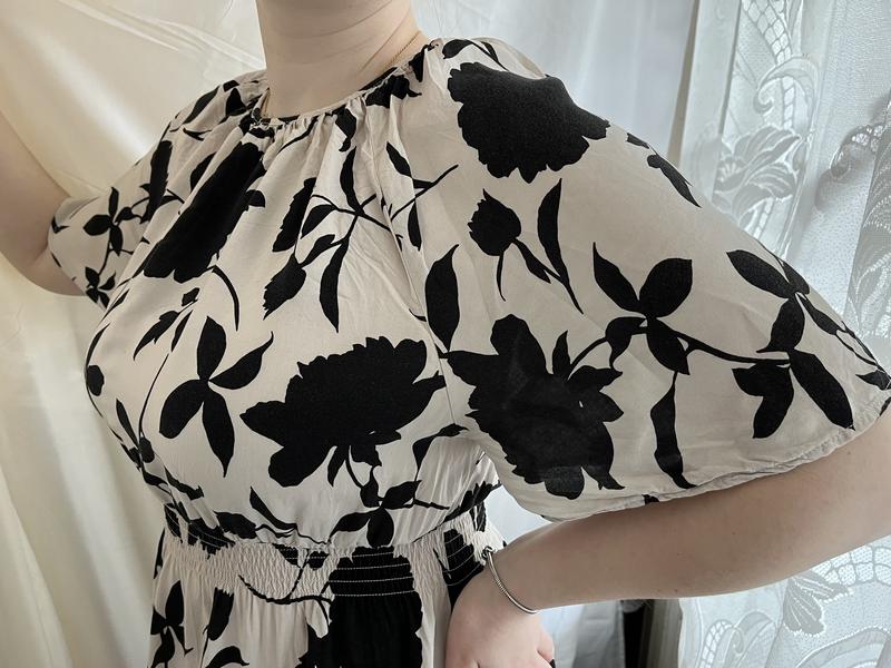 Платье миди из воздушной вискозной ткани. Круглый вырез и декоративная сборка по горловине. Разрез сзади с пуговицей у горловины. Широкие рукава реглан длиной до локтя. На талии резинка. Без подкладки. Размер по набору указан S, но фото модели размером L (XL)