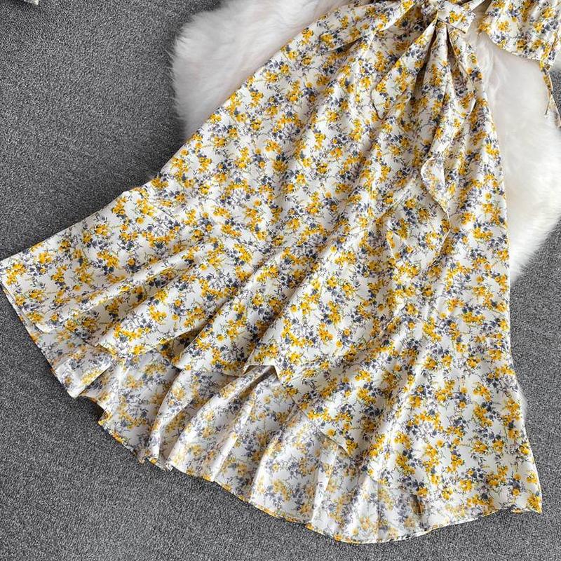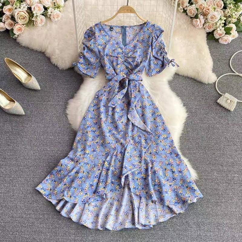 Женское серо-голубое легкое платье миди с разрезом на ножке и коротким рукавом в цветочки