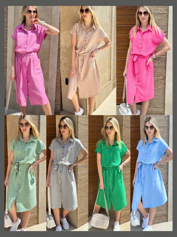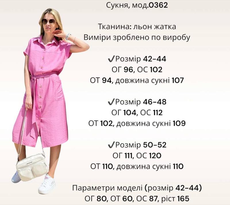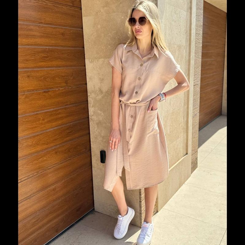 Елегантна сукня вільного крою з бічними накладними кишенями та застібкою на ґудзики - ідеальний вибір для комфортного та стильного повсякденного носіння. Рукав суцільнокроєний, короткий, зі спущеною лінією плеча, що забезпечує зручну посадку, пояс з'ємний, фіксується шльовками в бокових швах, підкреслює жіночність та витонченість образу