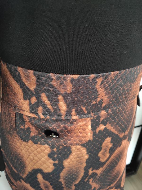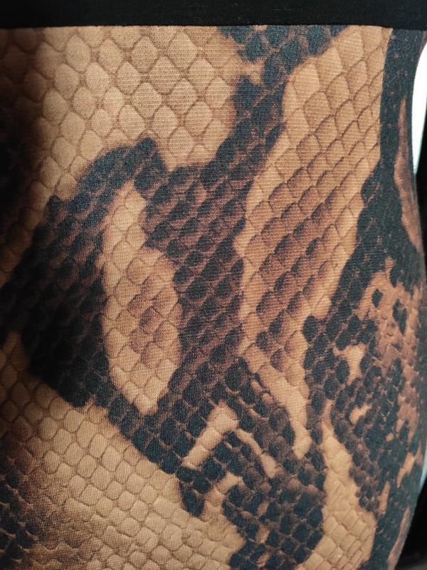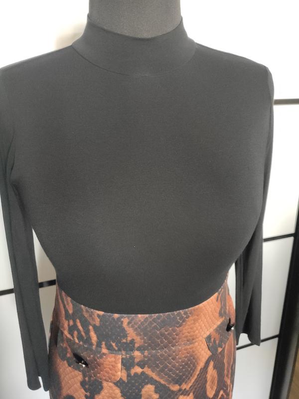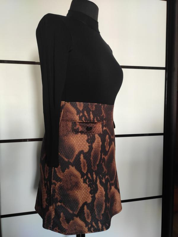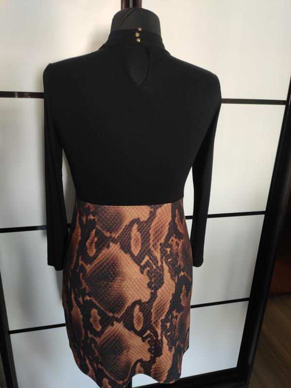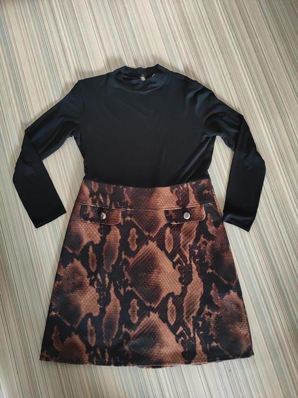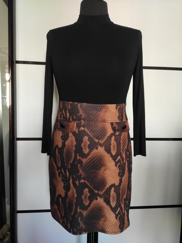 Стильное платье комбинированное, верх черный трикотаж, под горло, юбка животный принт,