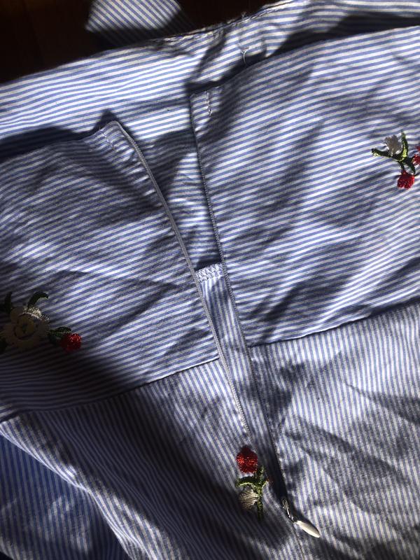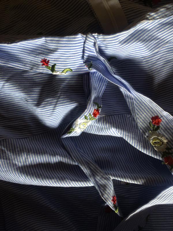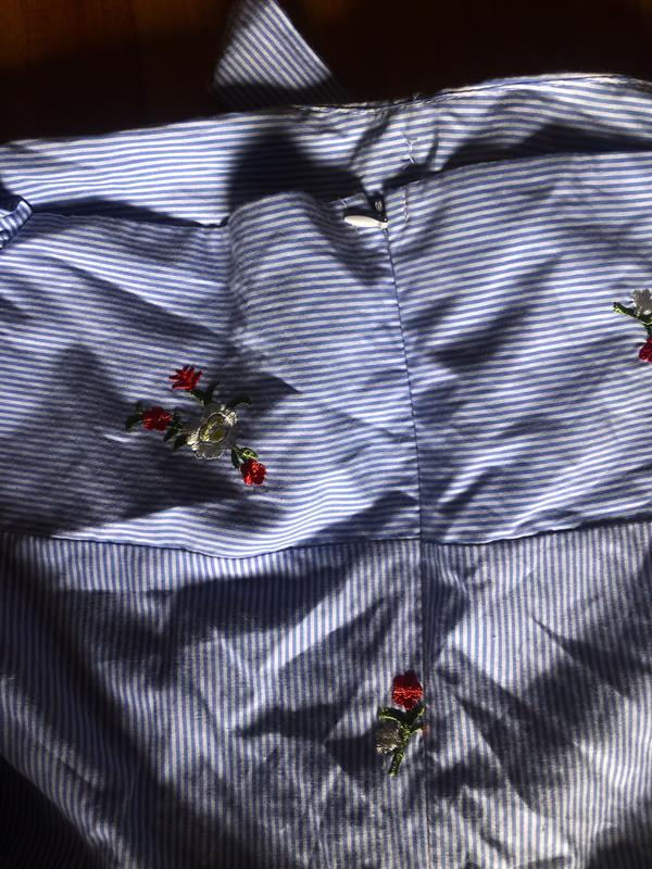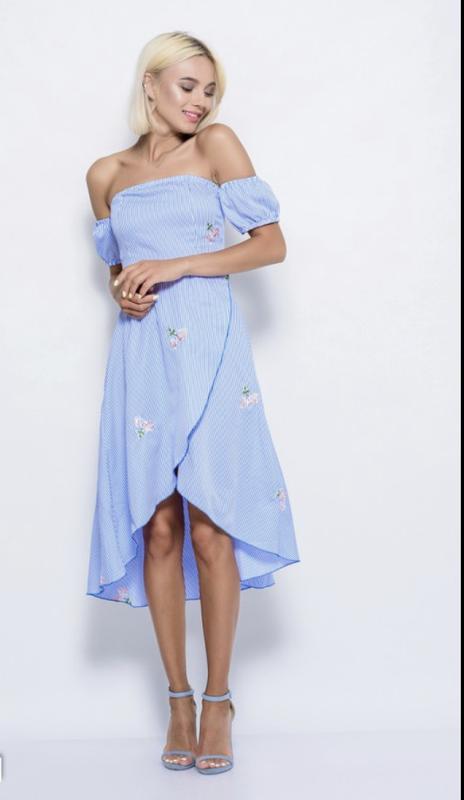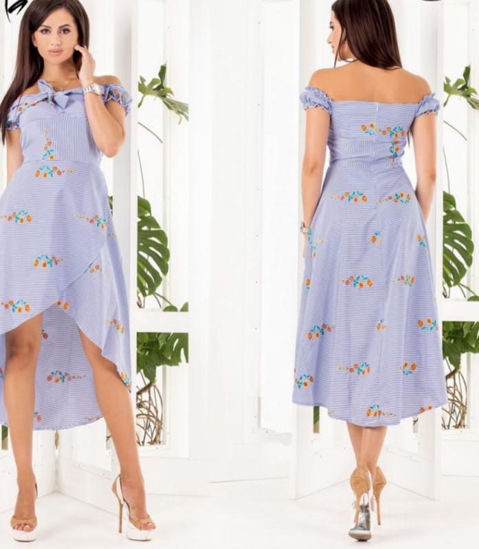 Летнее платье в полоску, дополненное цветной вышивкой: открытые плечи с резинкой на рукавах, завышенная линия талии, бантик притачной на кокетке, асимметричная юбка с фиксированным запением.Размер 52 подойдет на 46- 52