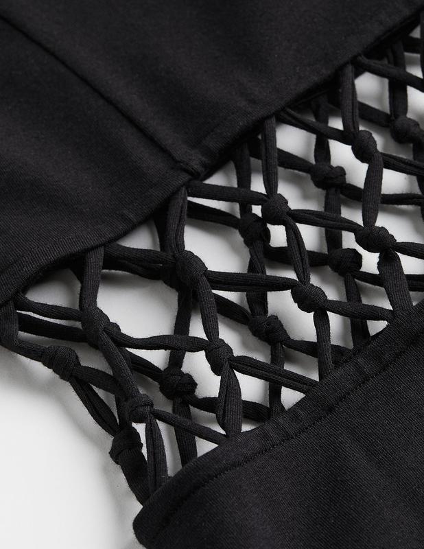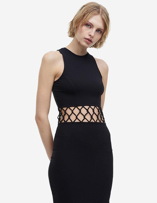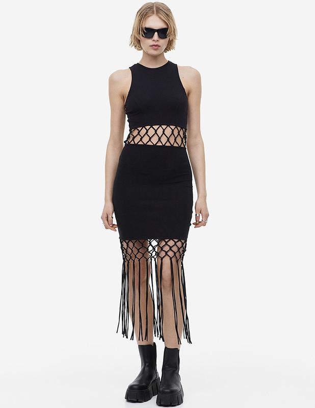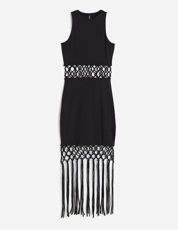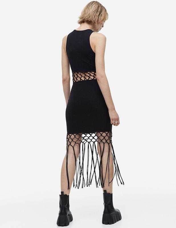 Платье без рукавов из нежного хлопкового трикотажа по фигуре. Круглый вырез горловины и вырез на талии. Декоративная тесьма вокруг выреза и внизу. Край платья обработан длинной бахромой