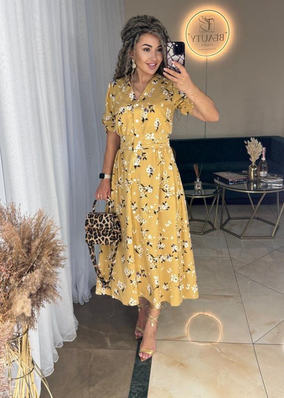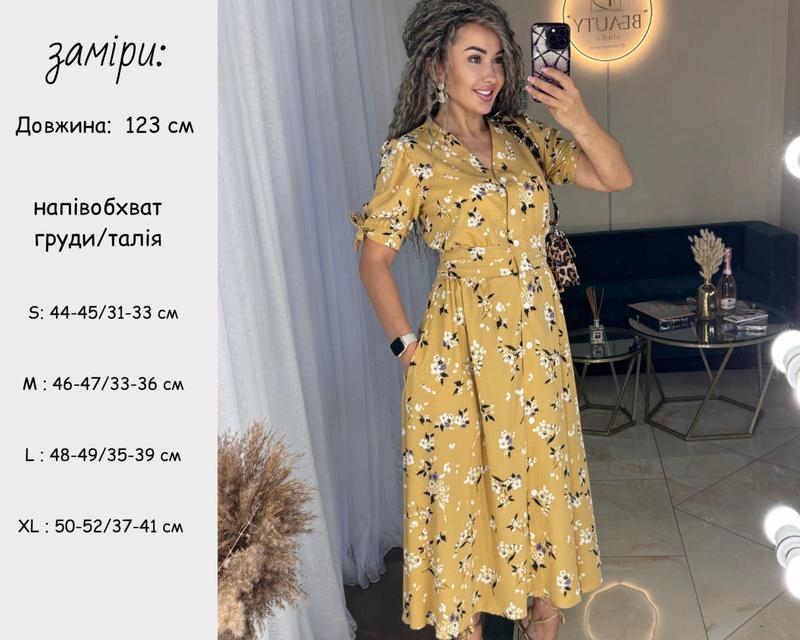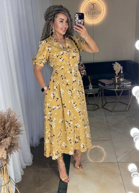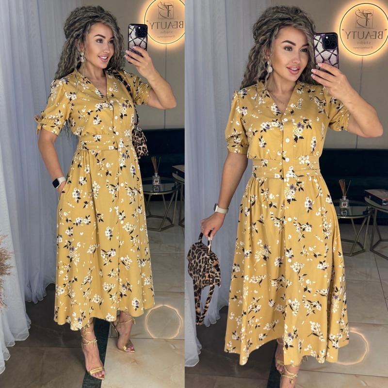 Описание: Платье миди длины из мягкого софта с короткими рукавами на завязках. Модель на пуговицах с V-образной горловиной и декоративными складками, в боковых швах есть карманы.
