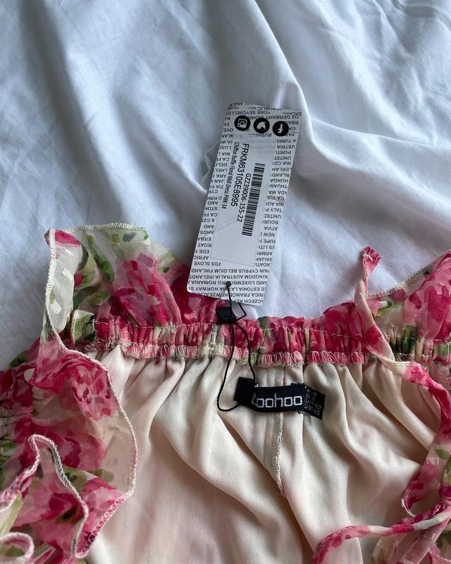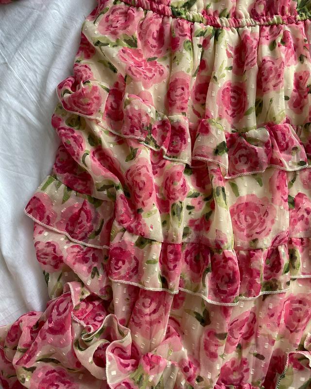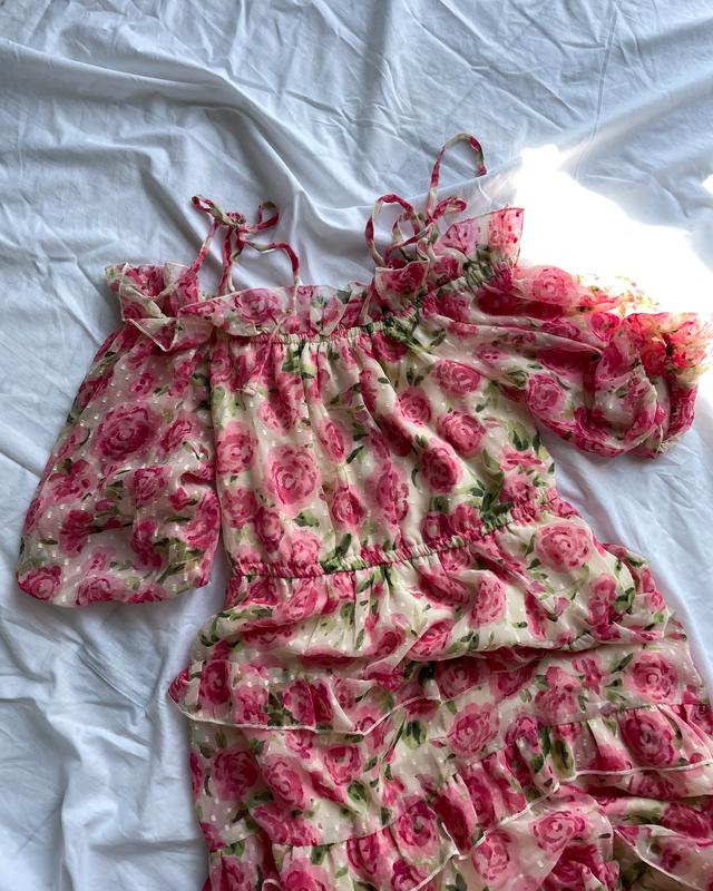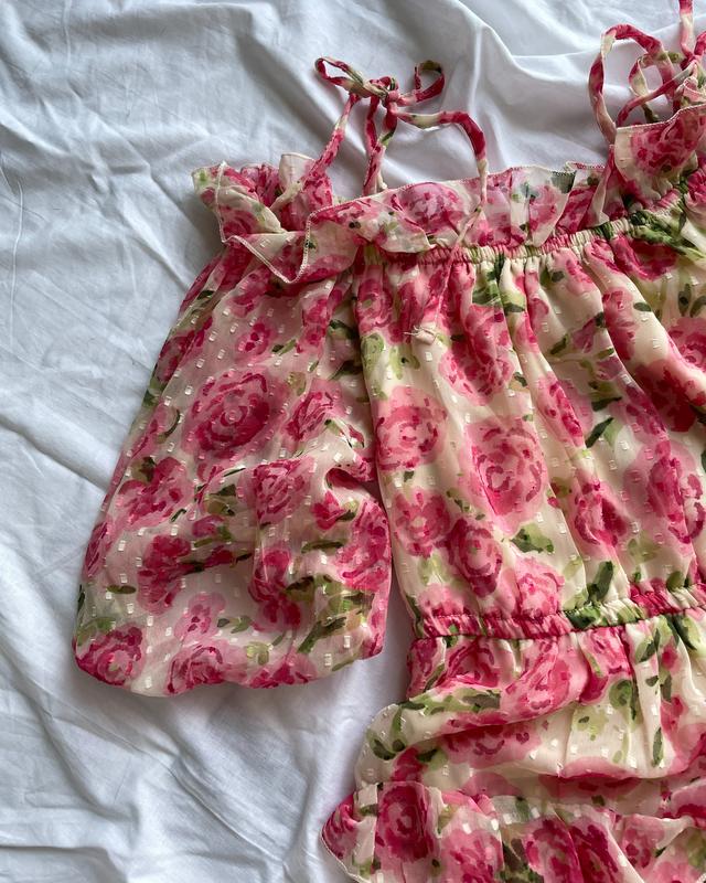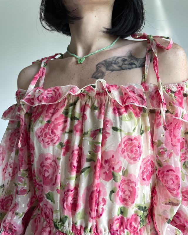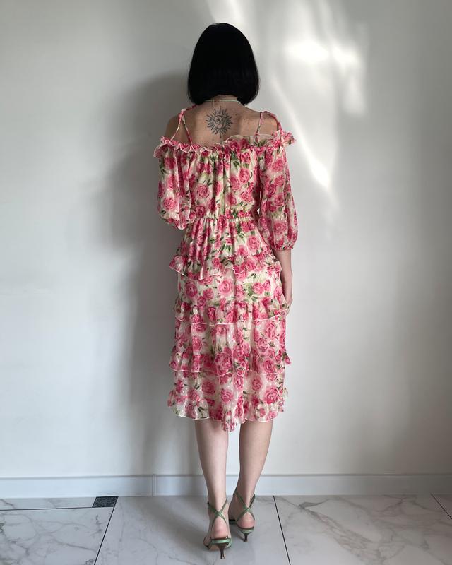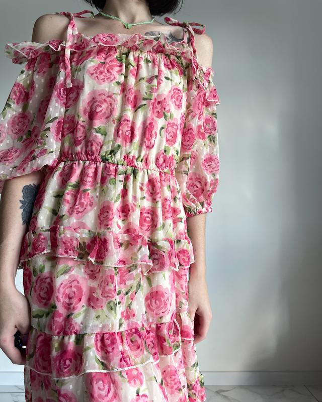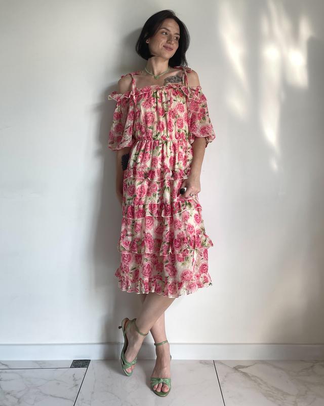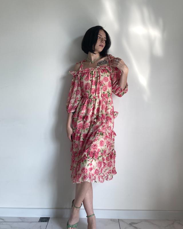 Нежное шифоновое платье в розы Длина меди Есть подкладка Лямки на завязке, можно регулировать длину Размер XXS / 40