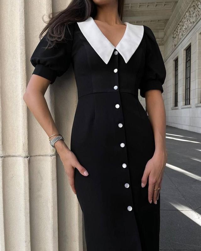 Платье с белым воротничком не теряют своей актуальности. Классический темперамент модели придает черный цвет. Завершают образ декоративный воротник и белые пуговицы. Черный цвет подходит для любого сезона. А чорна платье - это всегда лучший выбор для любого мероприятия.