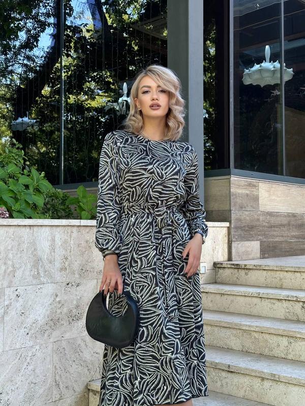 Шелковое платье-миди с длинными рукавами свободной юбкой в принт