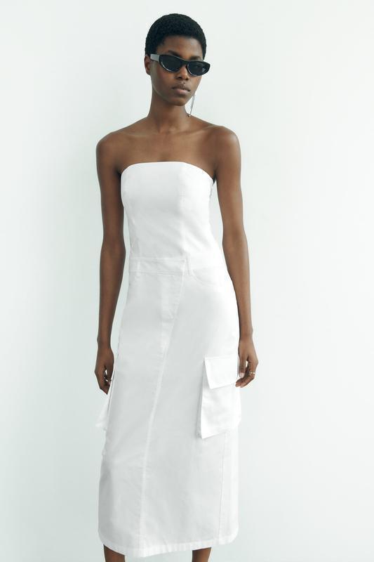 Габардиновое платье средней длины с открытыми плечами и прямым верхом. Застегивается на скрытую молнию сбоку. Имитация карманов спереди и сзади, накладные карманы внизу и разрез сзади.