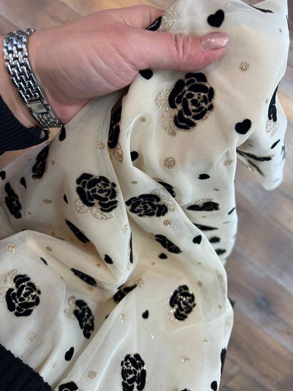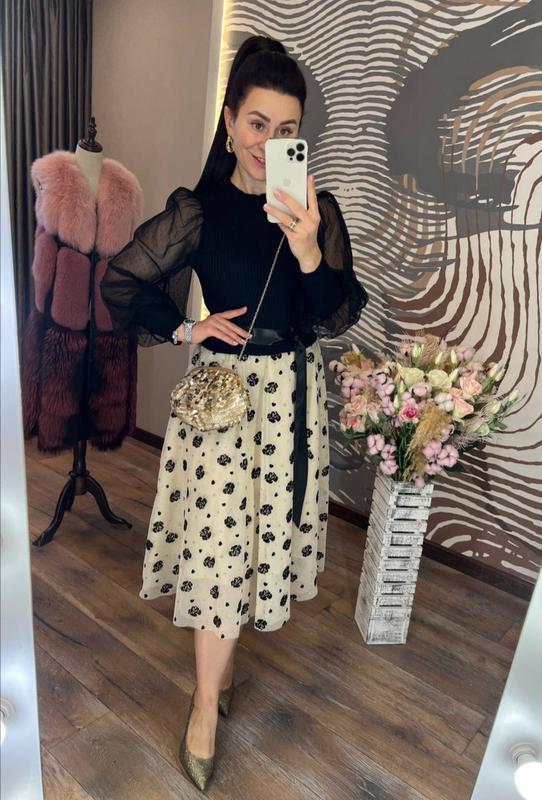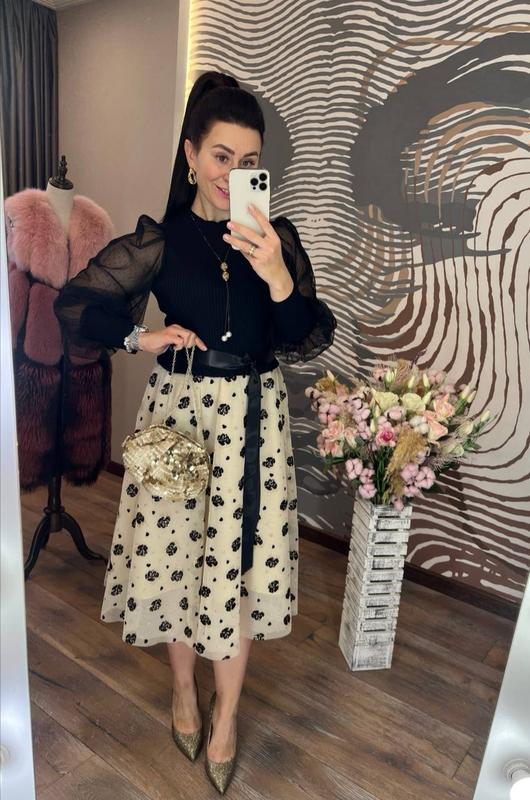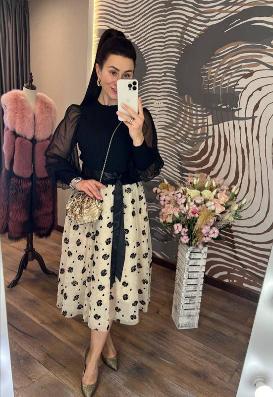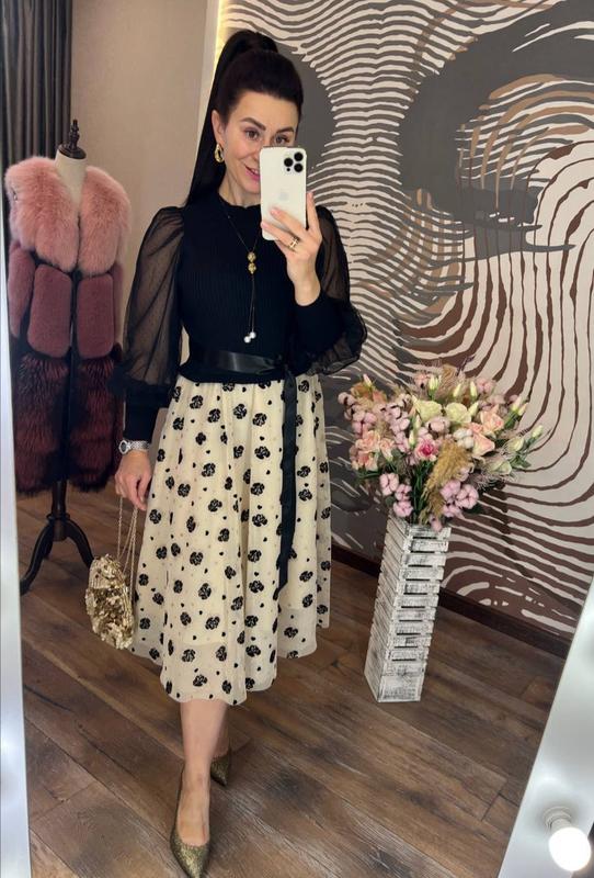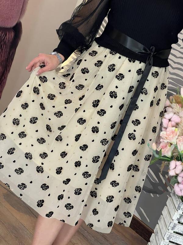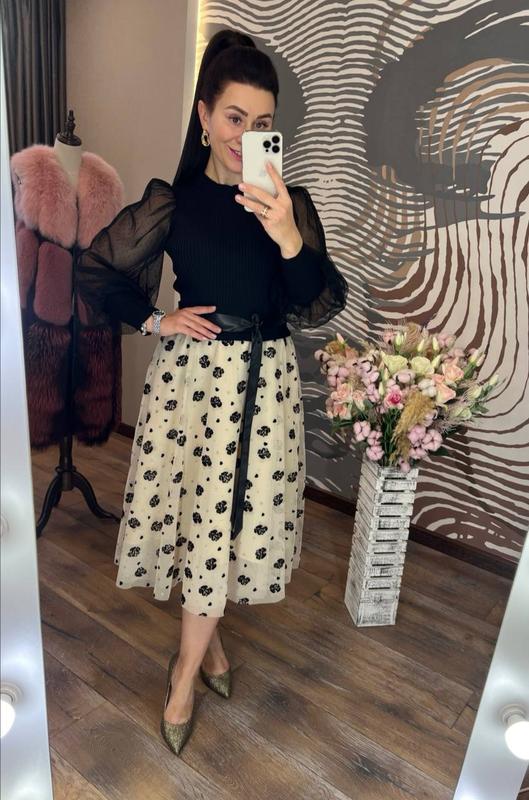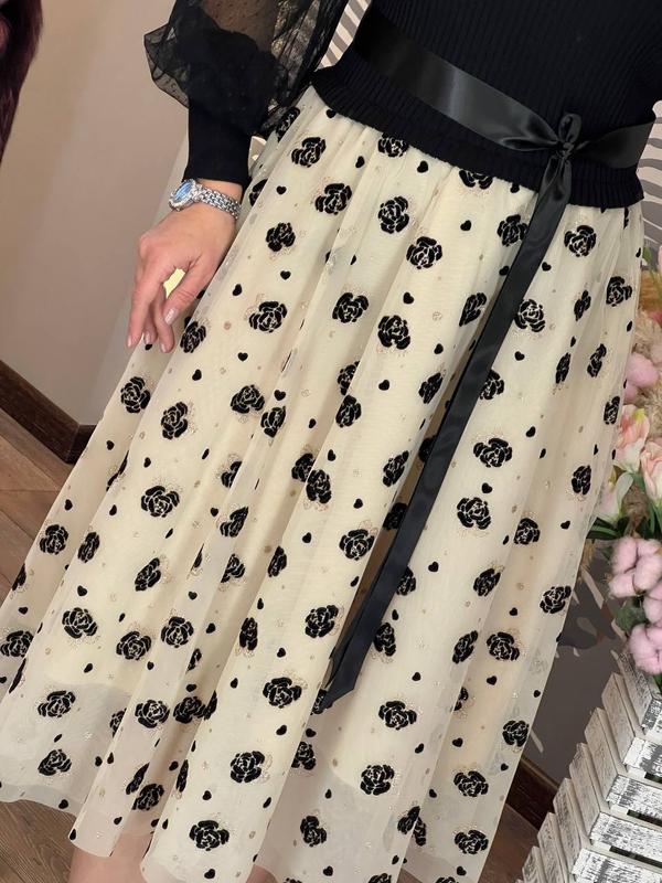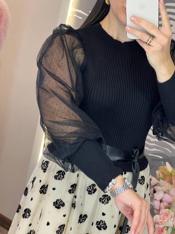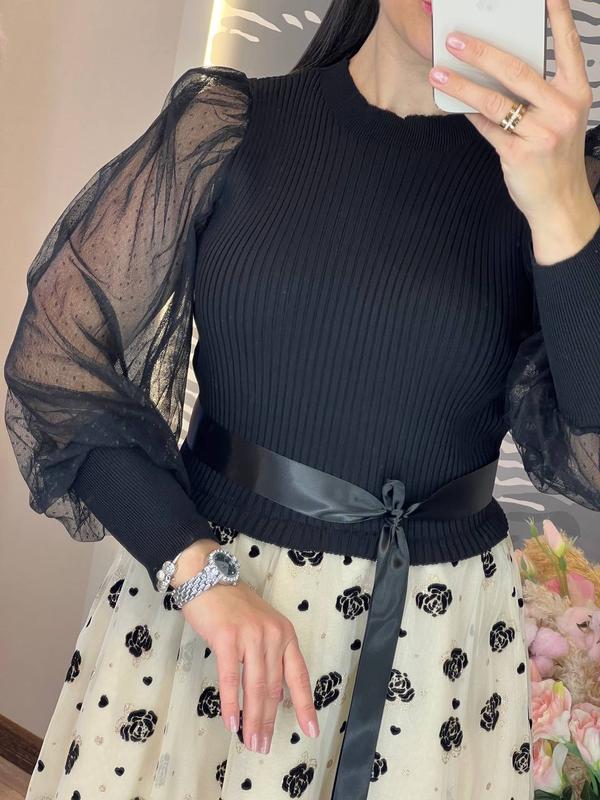 шикарное платье приталенного кроя с круглым горлом, рукавами из нежной полупрозрачной сетки на высоком манжете, пышной юбкой, с подъюбником, выполненной из светлого фатина, украшенного набивным декором, атласного пояса и эффектной верхней части из трикотажа машинной вязки с продольным узором, обязательно привлечет ваше внимание, подчеркнет красоту фигуры и создаст хорошее настроение