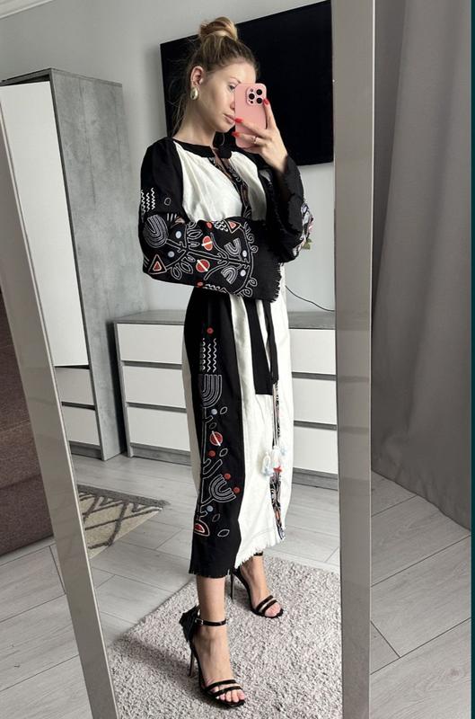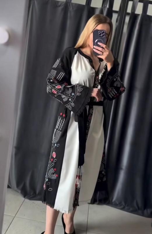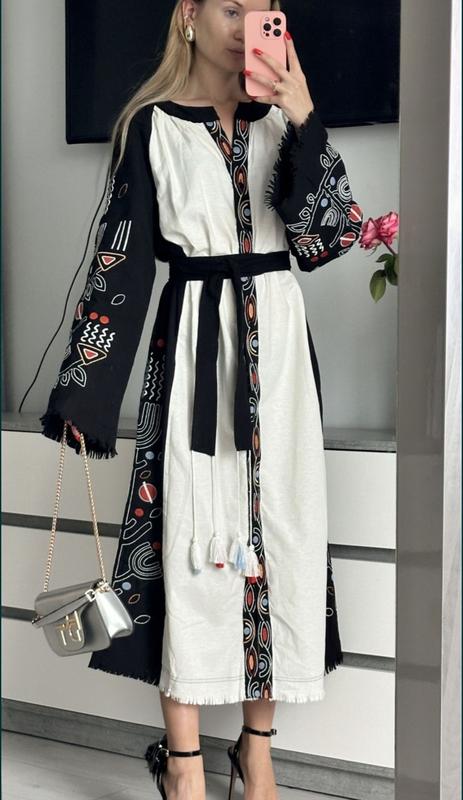 Платье-вышиванка с вышитой аппликацией, на завязках, под пояс, застежки- пуговицы