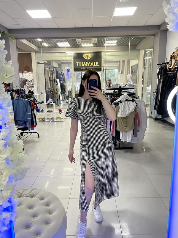 Это платье в стиле casual с черно-белым узором «ингем» сочетает в себе комфорт и утонченность. Приталенный крой удачно подчеркивает силуэт, а линия талии имеет легкую сборку, которая добавляет элегантности. Платье имеет короткие рукава с мягким объемом, округлый вырез горловины и аккуратную застежку-молнию на спинке, скрытую складками ткани. Низ платья украшают разрезы спереди, придающие образу игривость и удобство при ходьбе. Длина - миди, что делает ее универсальным выбором как для повседневных образов, так и для особых событий.