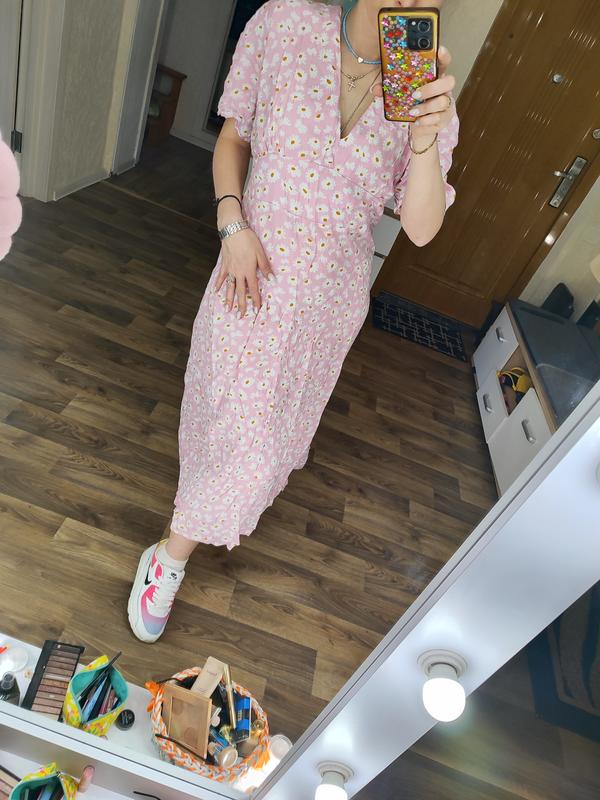 Розовое летнее платье миди в цветочный принт