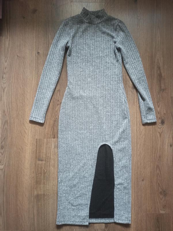 Серое миди платье с разрезом на ножке