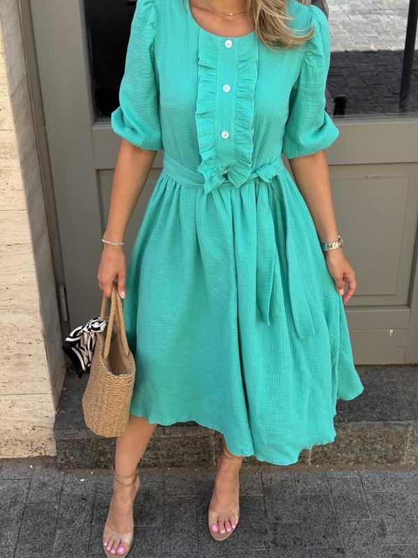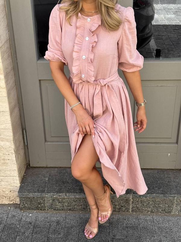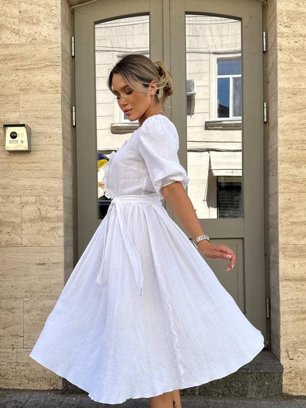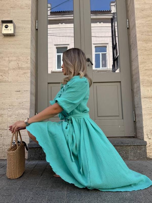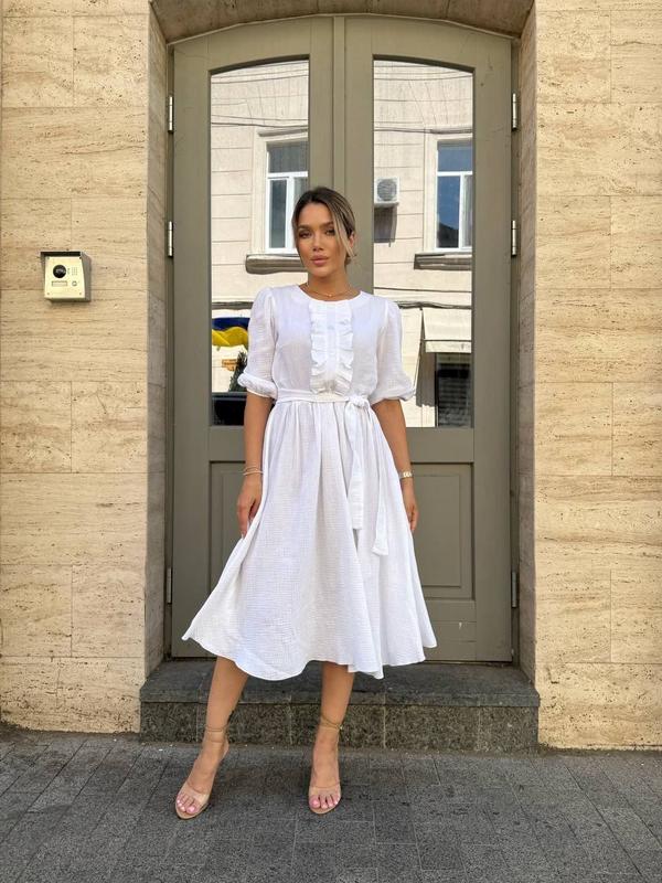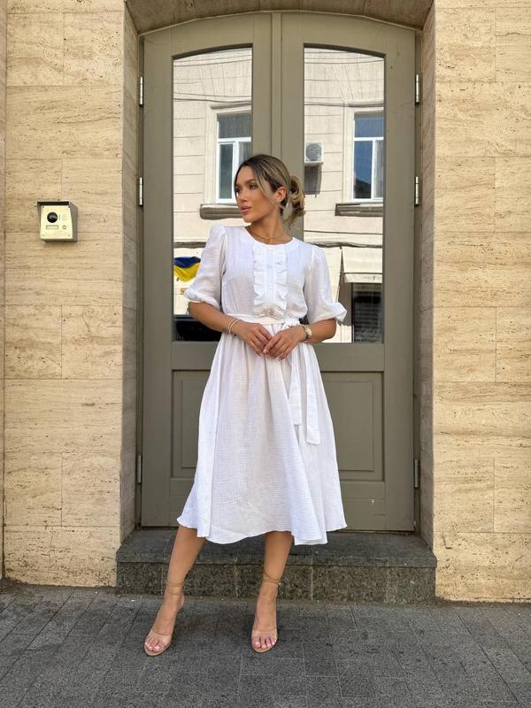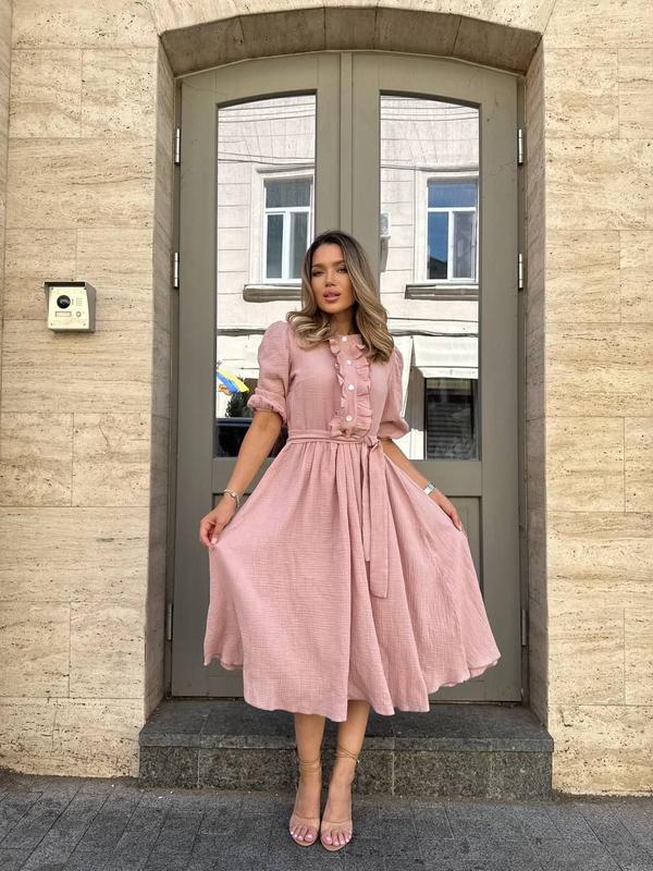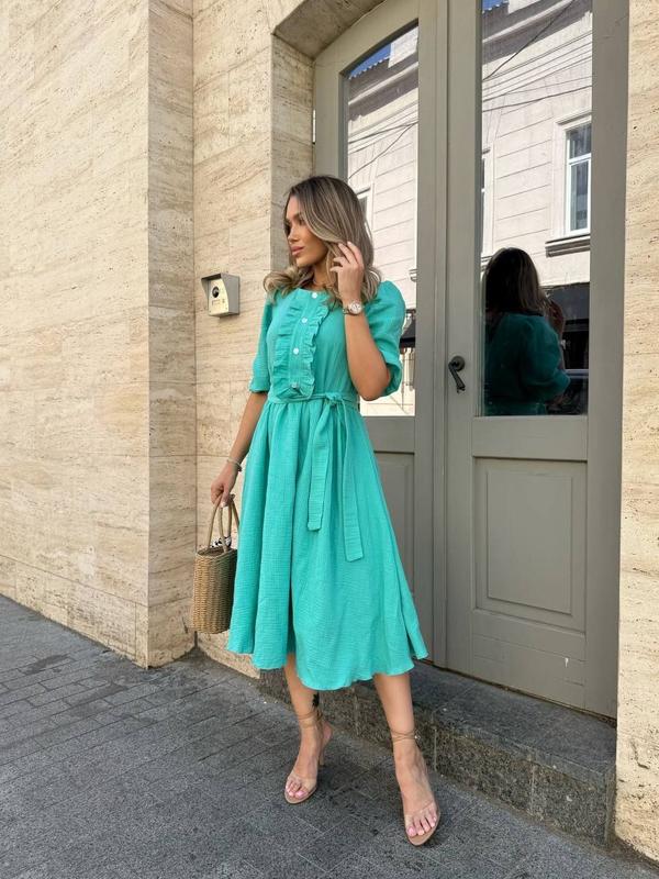 Платье длины миди из легкой, дышащей ткани - идеальный выбор для летних прогулок и романтических встреч. Модель имеет свободный крой, подчеркнутый поясом на талии, что добавляет фигуре женственности. Верх украшен аккуратными пуговицами и деликатными воланами, которые создают утонченный, но непринужденный образ. Рукава - укороченные, с мягкими собраниями.