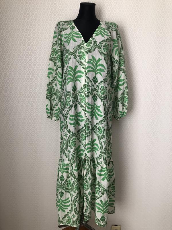 Летнее платье рубашка от H&M, размер XS-L. Состав: 73% вискоза, 27% полиамид. Свободный фасон. Лёгкая ткань. Комбинация зелёного и белого в цветовой гамме. Принт - тропическая флористика.V-образный вырез. Длинный рукав реглан с резинкой по краю. Застёгивается на пуговицы по всей длине. Без карманов. Нюансы и дефекты отсутствуют. Не просвечивается!Показала посадку на манекенах двух размеров S и L (параметры манекенов в объявлении ниже), считаю что в обоих случаях выглядит достойно ! ) Замеры изделия в не растянутом виде, см:плечи ,подмышки (примерно равно ПОГ) 48,5,ПОТ 49,5,ПОБ (Замер делаю на расстоянии 65 см от плечевого шва, если вещь короче, то по краю изделия) 57,5,длина 130,длина рукава 67 от линии горловины.Объёмы желтого манекена, см :плечи 40,ОГ 97,ОТ 77, ОБ 100Объёмы черного манекена, см :плечи 39,ОГ 87,ОТ 63 ОБ 90Отправляю Новой почтой либо наложенным платежом (при условии оплаты доставки в оба конца), либо по предоплате на карту Приват, Укрпочтой по предоплате, Meest по предоплате Продаю много фирменных вещей Airfield, Strenesse, Gerry Weber, Steilmann, Brax, Bonita, Basler, Frank Walder, Apanage, Olsen, Ulla Popken, Gardeur, Monari, Rabe, Guess, Hauber, Marks&Spencer, Concept K. Много новых вещей (с этикеткой) - можно на подарок. Смотрите другие мои объявления. Спасибо, что заглянули :-)
