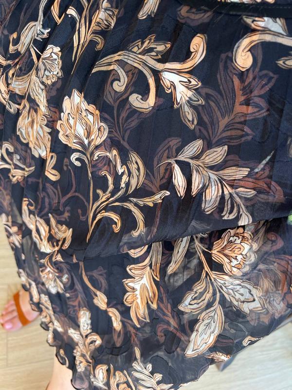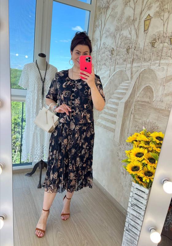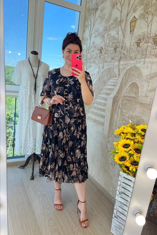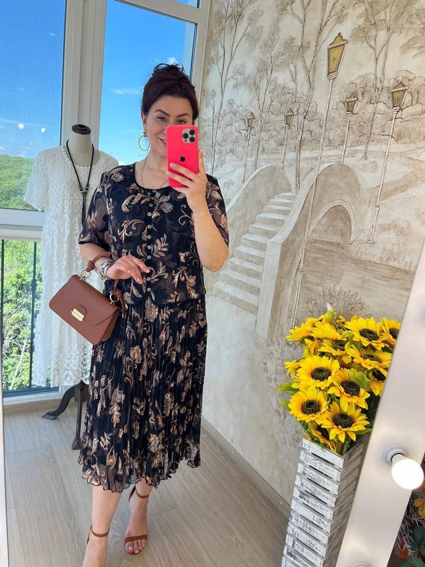 платье свободного кроя с короткими рукавами, круглым вырезом, приталенной верхней частью с защипами на талии и эффектной плиссированной юбкой внизу, выполненное из креп шифона высокого качества с удивительно красивым 3 D принтом на подкладке по всей длине, платье украшено симпатичными пришитыми пуговицами спереди