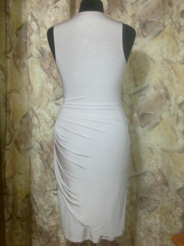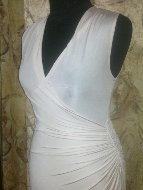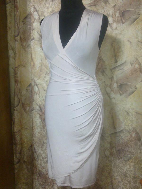 Стильное, модельное платье, эффектной, нарядной, светло-бежевой расцветки, имеет приталенный фасон, за колено-миди, вырез назапах, драпированный в бок, по низу, спереди и сзади, идет дополнительная, за округленная листва. Изготовлено брендовой, немецкой фирмой Н/М, из 95%вискозы и 5%эластана, приятная, почти, натуральная, тонкая, трикотажная ткань со стрейчевым эффектом, "масло", отлично тянется. Состояние отличное, размер указан 44-46, М. РАЗМЕРЫ: ПОГ.=46см(тянется до 52см), ПОТ.=38см( до 45см), ПОБ.=48см( до 56см), Длн.издл.=107см, Шир.плеч=29см. ЛОТЫ КОМБИНИРУЮ!!!