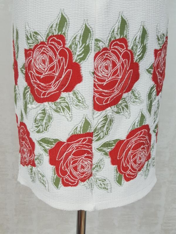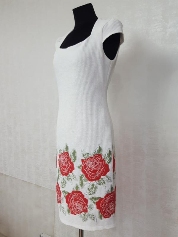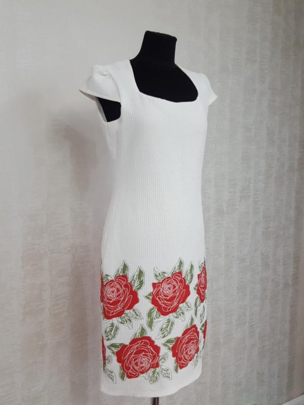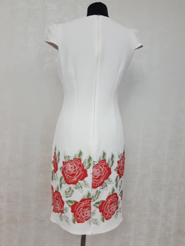 Нарядное трикотажное платье на подкладке с красивым купонным рисунком внизу изделия.Потайная застёжка-молния на спине длиной 50см.Размер М