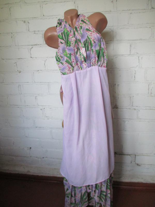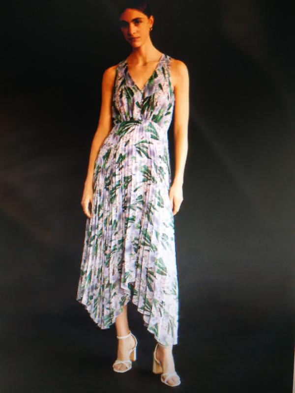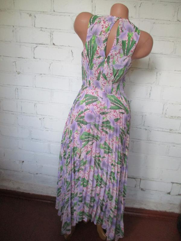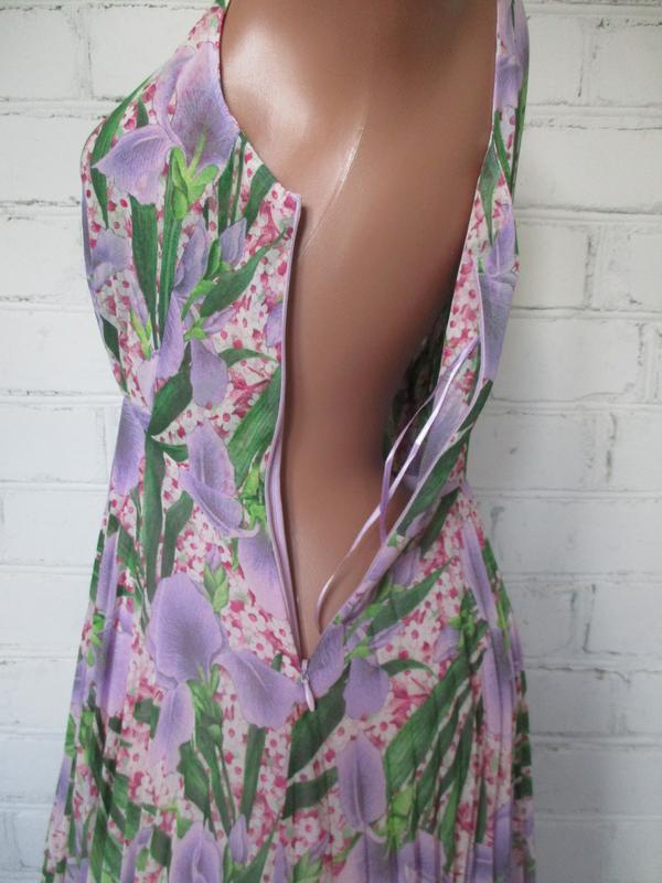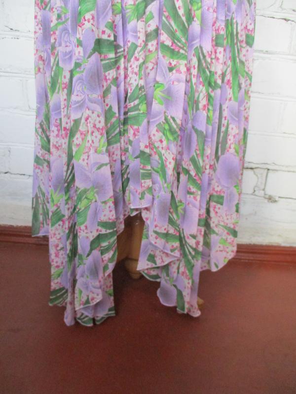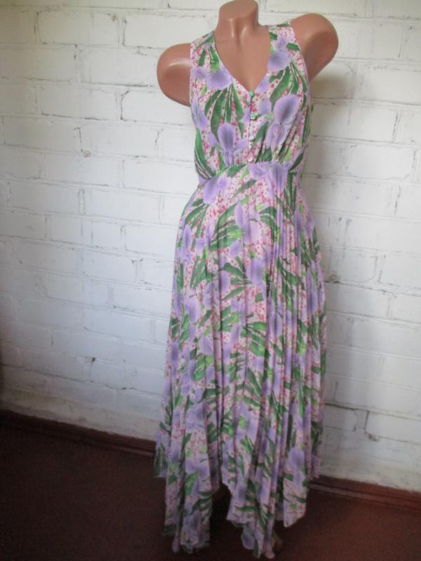 Платье плиссированное в цветочный принт шифоновое миди/макси, асимметричный низ. Размер указан S 165/84A. Ширина по груди 42-44 см, ширина шва под грудью 35 см, плечи 24 см, длина юбки платья в самом коротком месте 75 см, в самом длинном 97 см.