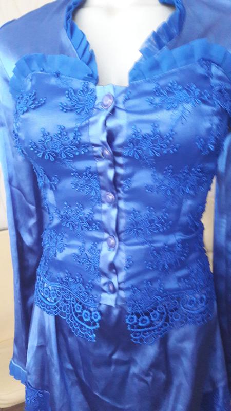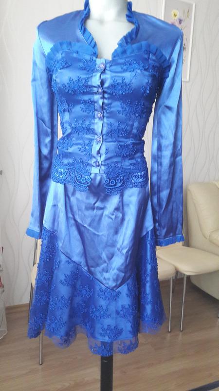 Костюм нарядный. Размер 38. Цвет синий- электрик. Замеры:Пиджак: длина- 53см, длина рукава- 61см, плечи- 36 см, объем груди- 84см. ЮБКА: длина- 55 см, талия- 62см, бедра- 90см.