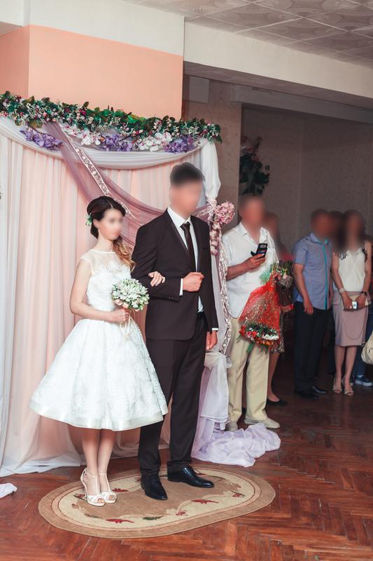Эксклюзивное свадебное платье маленького размера S (42-44 разм.). Юбка до колена (мой рост 1,61 м).