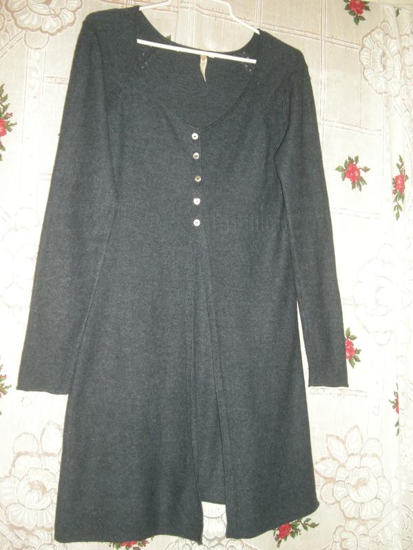 Классная,стильная,фирменная туника,33%вискоза,23%нейлон,20%коттон,20%шерсть,4%кашемир,застегивается впереди сверху на5 красивых пуговичек в цветочки и сердечки,проймы вокруг рукавов в красивой перфорации,на талии тоже перфорация в дырочки,длина рукава-63см.,объем груди-90см.,объем талии-84см.,длина туники-89см.