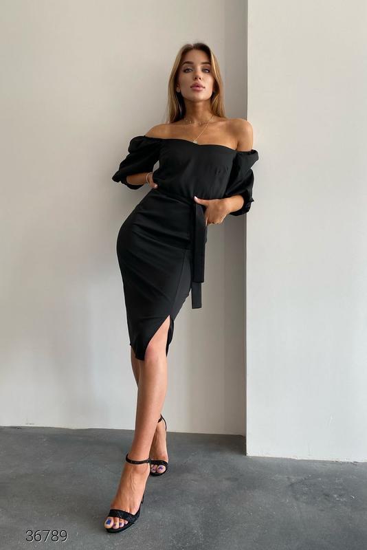 Платье-футляр из качественного костюмного крепа. Вырез-сердечком, объёмные рукава сверху на резинке. Разрез по нижней кромке, сзади застёжка на потайную молнию. В комплекте пояс из основной ткани.