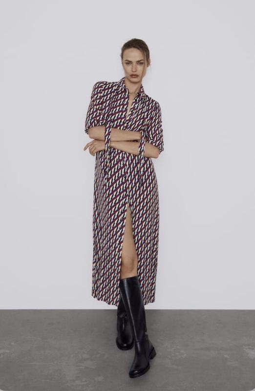 Шикарне плаття із останніх колекцій ZARA, розмір вказано М. Рукав вкорочений на манжеті ( резинка ), робочі гудзики, гудзики йдуть не до кінця, на шиї є завязка ( ззаді два шнурка ). Вживу як на фото з сайту. Нове, без бірки, торгу немає !Склад: 100% віскоза. Заміри:Пог 47 см + тягнеться до 50+ см; Пот 42 см;Рукав від плеча 53 см;Довжина від плеча 137-138 см;Довжина по спинці ( центру горловини ззаді ) 139 см.