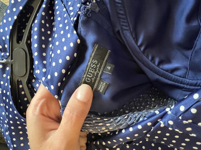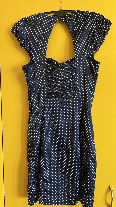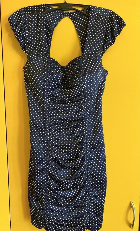 Стильна коктельна сукня фірми GuessАтласна в горошокОригінальна спинкаЄ паралонові чашечки (відповідно не потрібно одягати бюстгалтер)Одягалась 1 раз