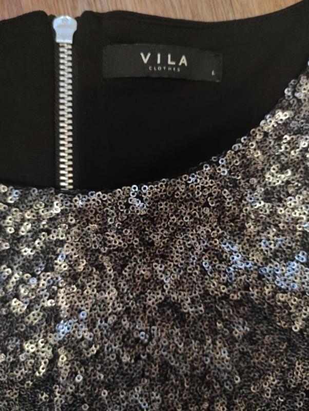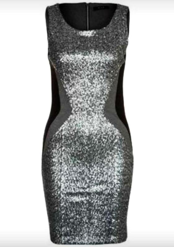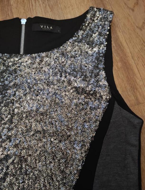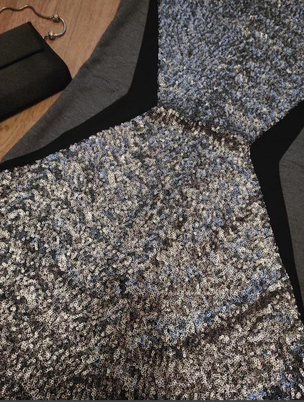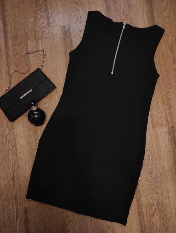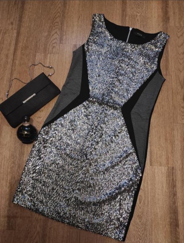 Шикарное короткое платье спереди в паетках, спинка черная, эластичная с застёжкой на молнию.