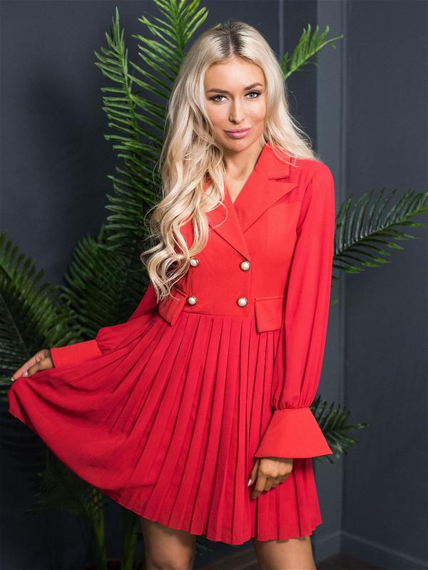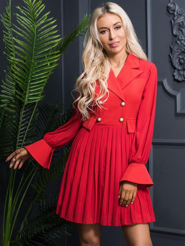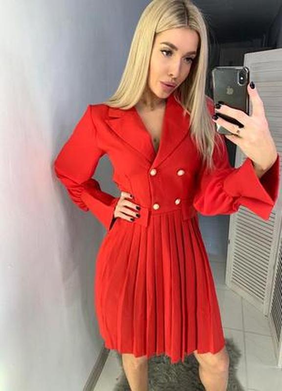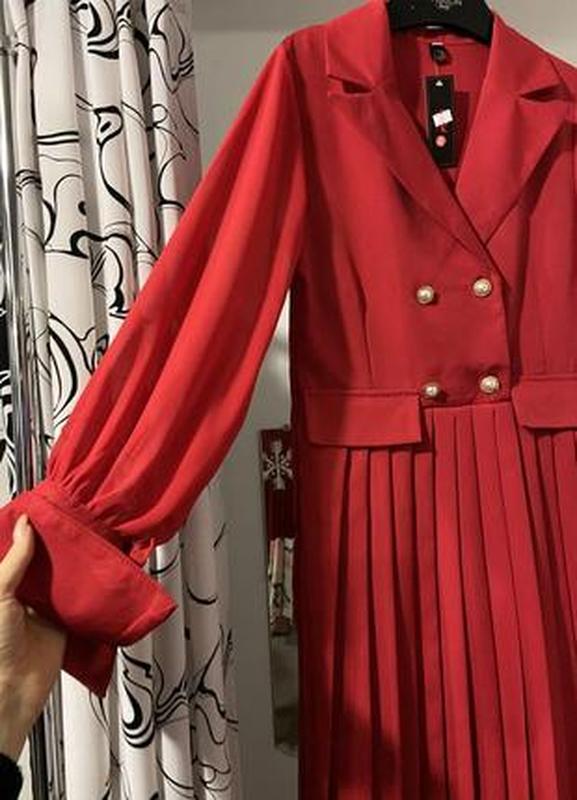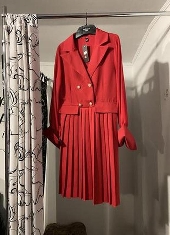 Красива сукня піджак відрізна спідниця плісе напівпрозорий пишний рукав шифон з манжетом ліхтарик , красива фурнітура гудзики під перли в золотій оправі з плетінням , застібається на прихований замок збоку , розмір на бирці l пог 47 см+ виточки піт 42 см поб без обмежень довжина по спинці 93 див .Бирок зі складом тканини немає