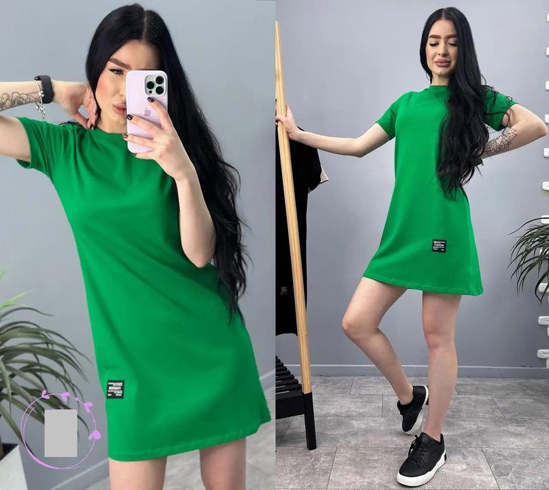 Платье представлено в пяти оттенках: классическом черном и бежевом, ярком зеленом, нежном голубом и персиковом. Благодаря универсальным цветам платье-футболка станет хорошей основой для многих повседневных образов для лета.