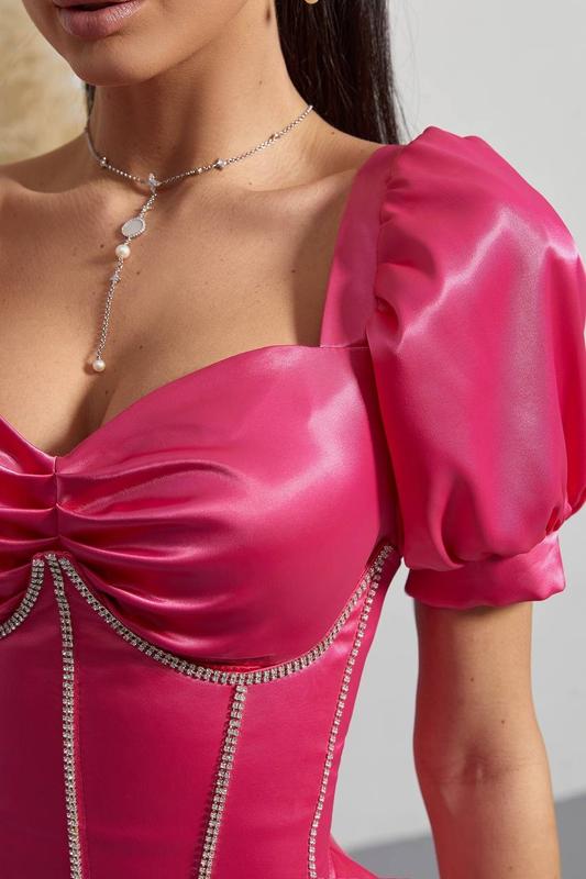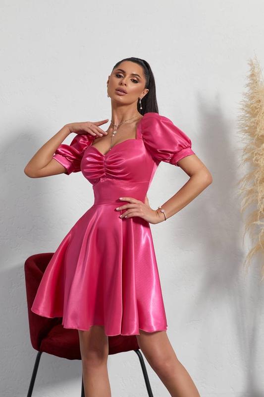 Платье мини выполнено из сатинового материала. Модель стилизовали пышными рукавами, лифом с фигурным вырезом и приталенным силуэтом. Расклешенная юбка не сковывает движения.