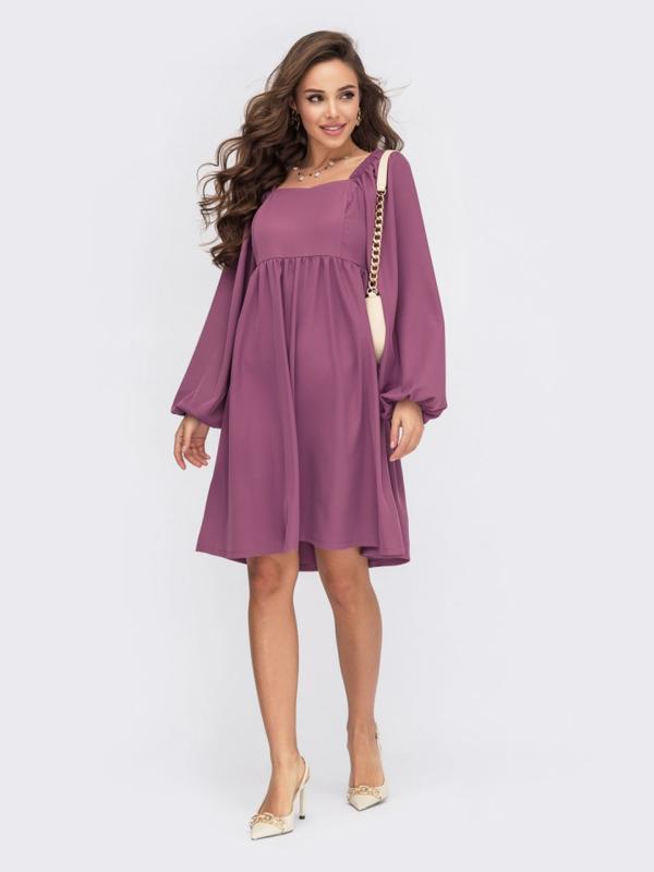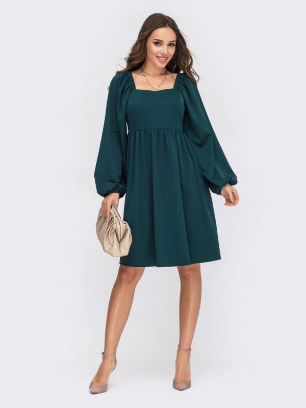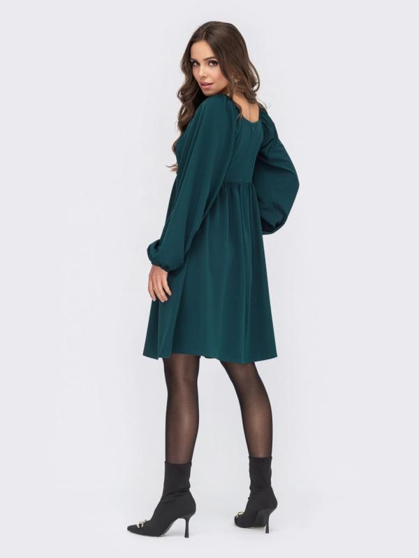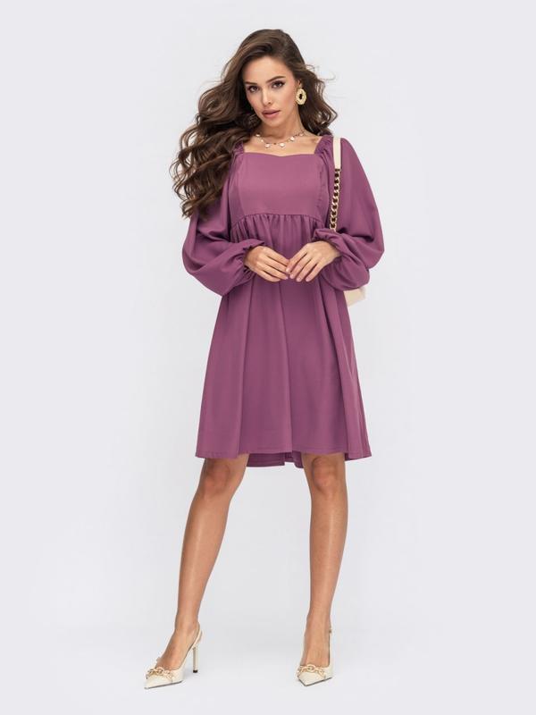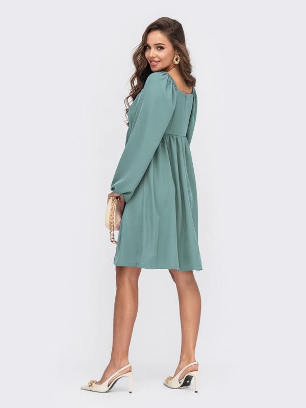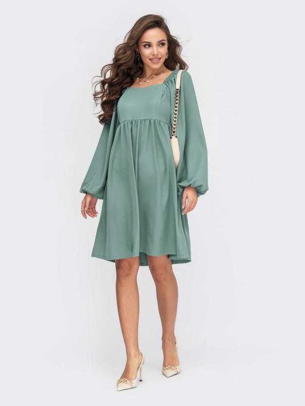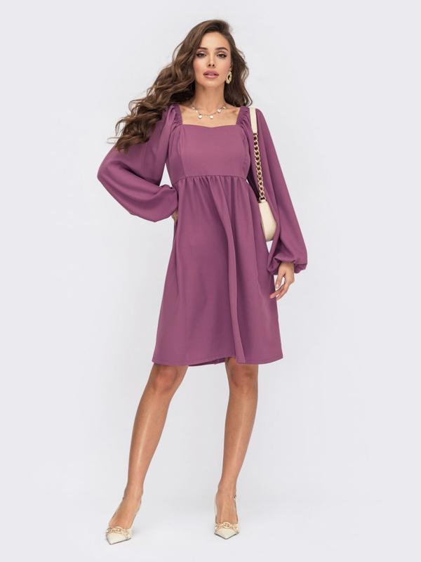 Платье из костюмной ткани с завышенной линией талии. Объемные рукава дополнены резинкой по глазу и на манжетах. Застегивается на молнию сзади.